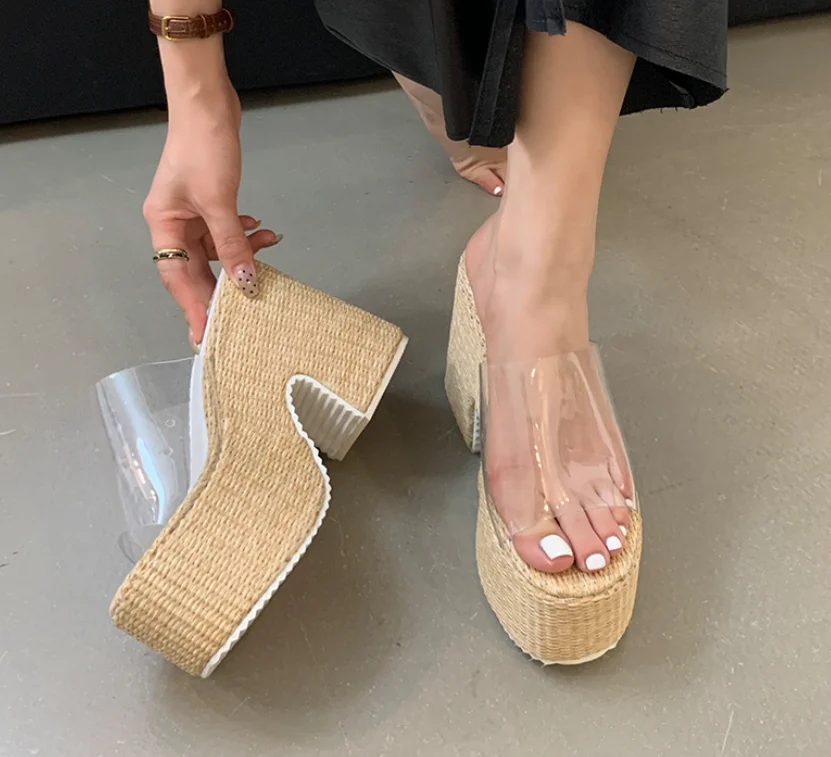12cm Chunky Heeled Slippers 6cm Platform Block Heels Sandals Women Beach Shoes Summer Clear Sandals
