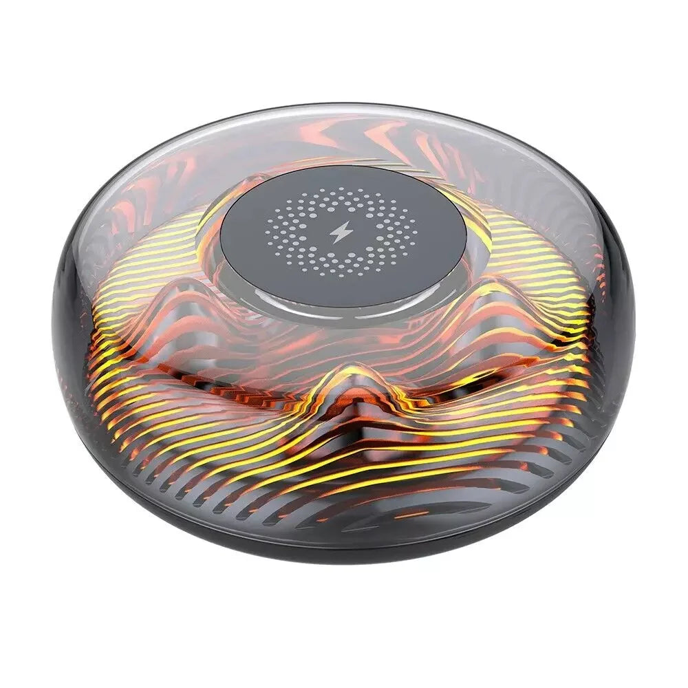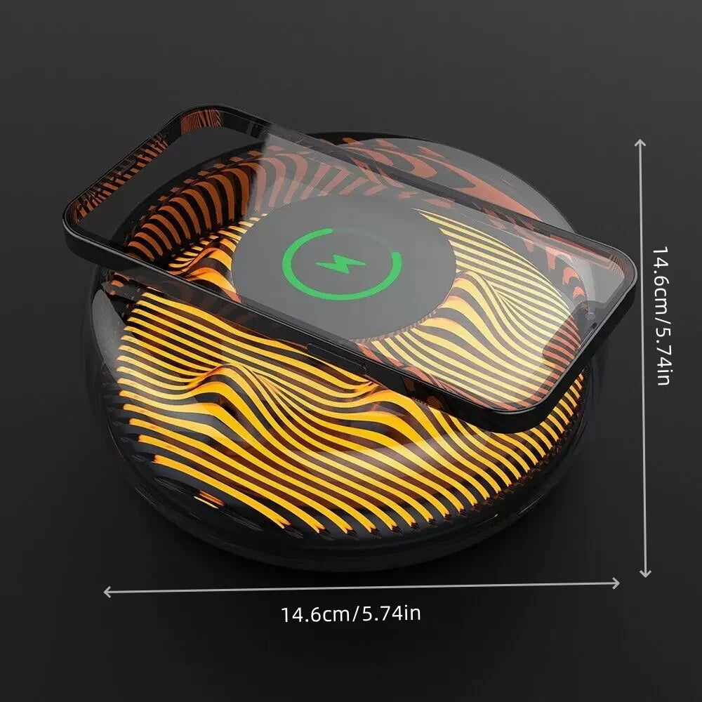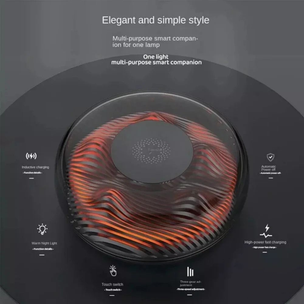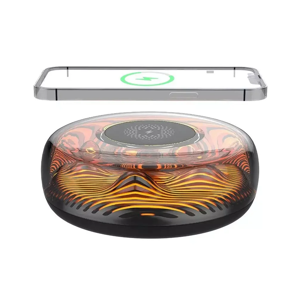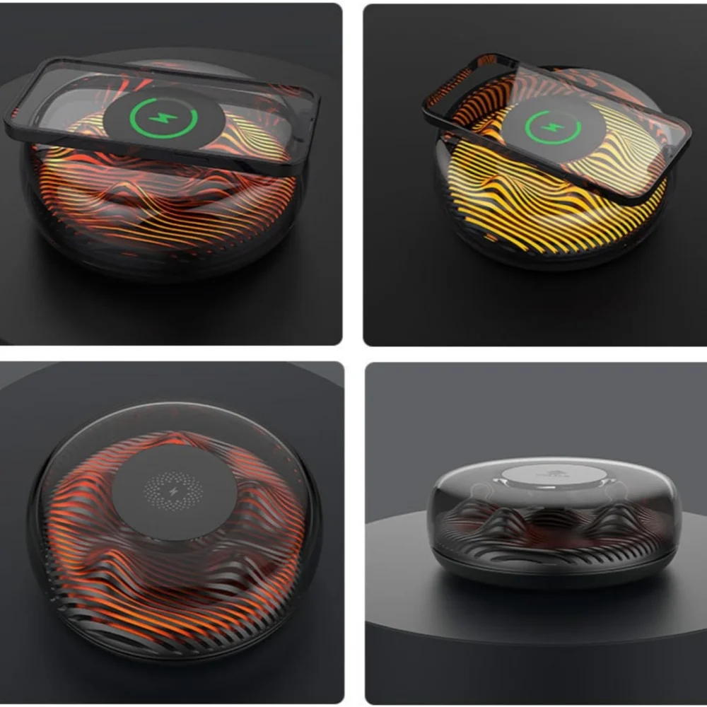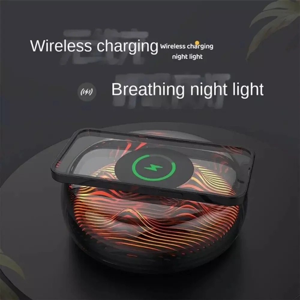 This 15W flame light wireless charger. After connecting to the power supply, place the phone in the middle of the charger to charge the phone. By touching the bottom, a gentle flame light will be emitted, and the light intensity can be adjusted by touch. It is very convenient and simple to use, and it is very suitable for decorating your bedside table.