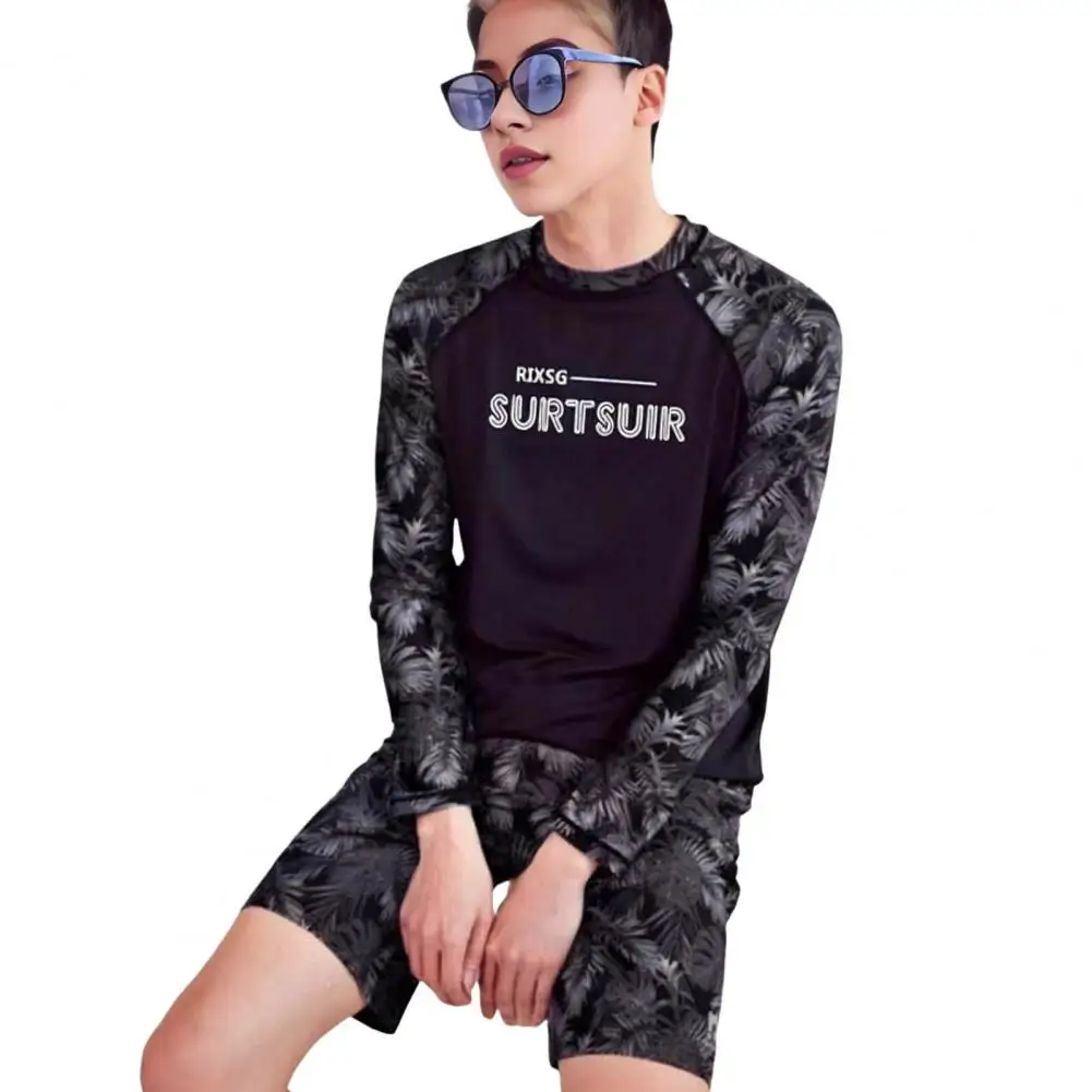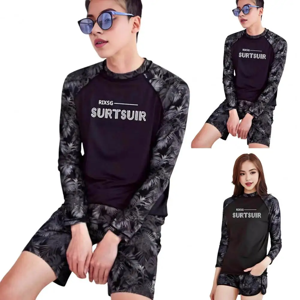 2 Pcs/Set Unisex Swimsuit Quick-drying Breathable Soft Leaf Print O Neck Long Sleeves Couple Surfing Clothes Diving Bathing Suit Water Sport Swimwear