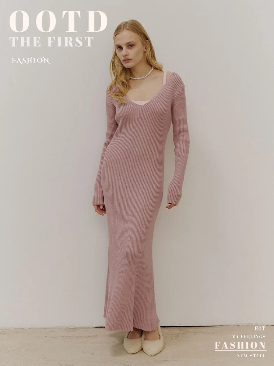 2025 Autumn Women's New Solid Color Long Sleeve V-neck Slim Bodycon Knitted Maxi Dress Trendy Elegant Fashion Sexy Dresses