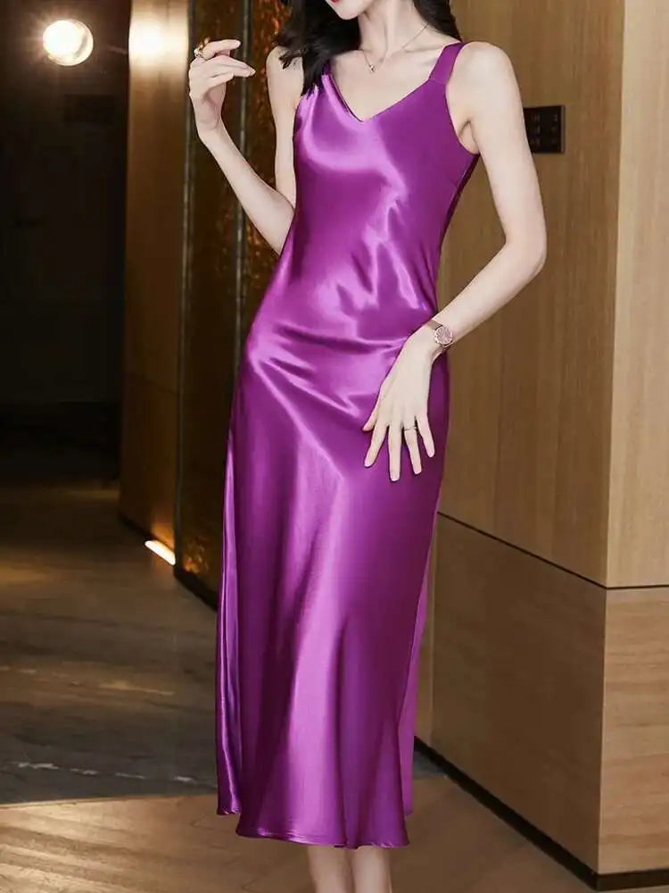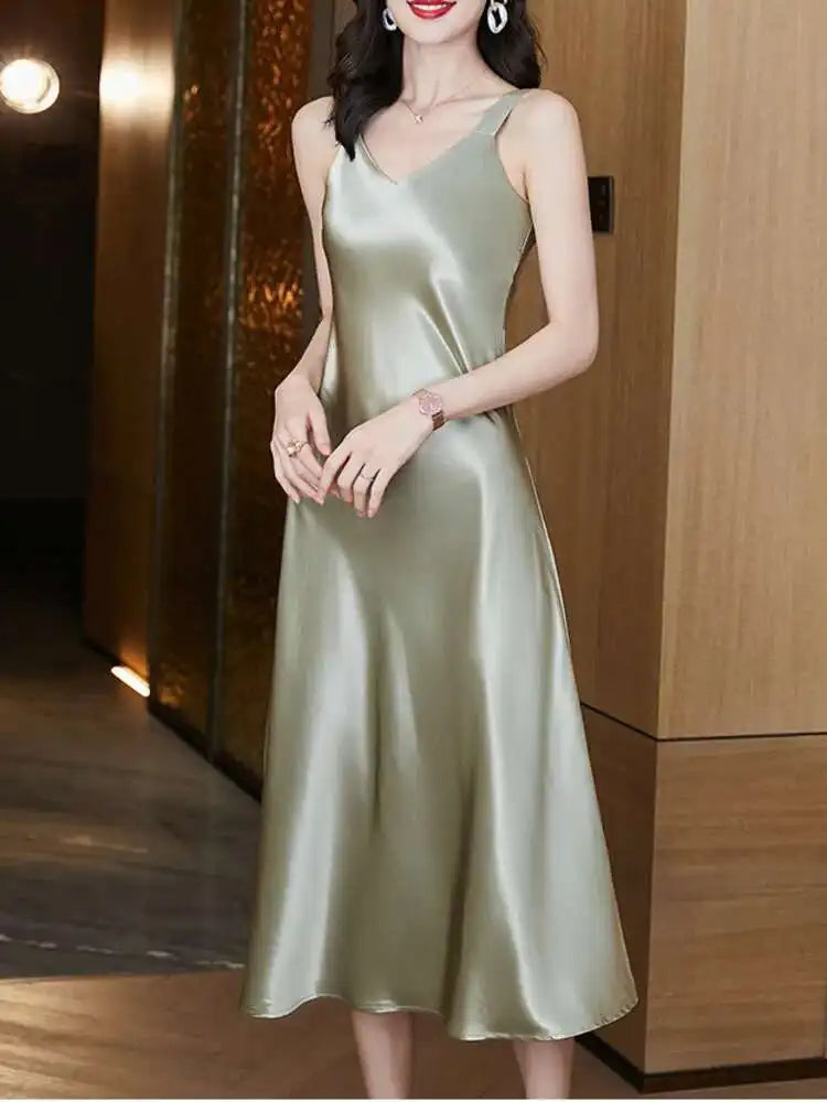 #4930 Sleeveless Spaghetti Straps Midi Satin Dress Women Solid Color V-neck Sexy A-line Party Dresses Women Evening Summer 2025