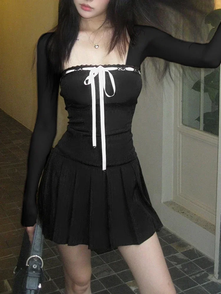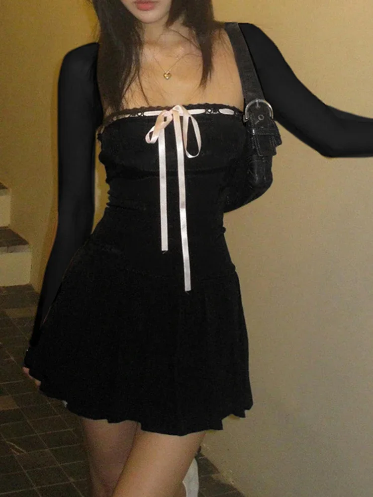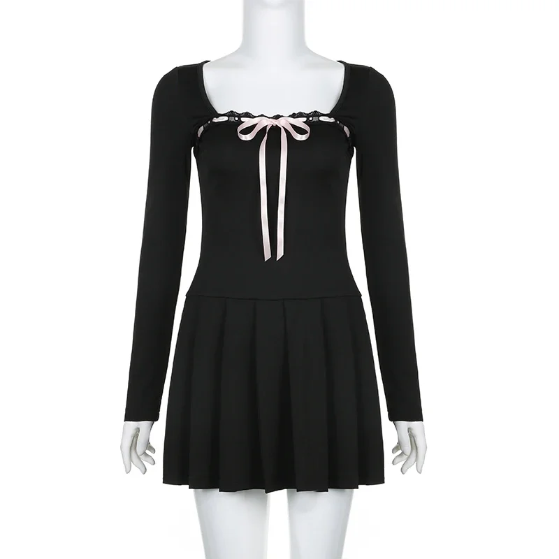 Black Lace Up Square Collar Dresses Fashion Women Balletcore Aesthetic Bodycon Long Sleeve Mini Dress Korean Style