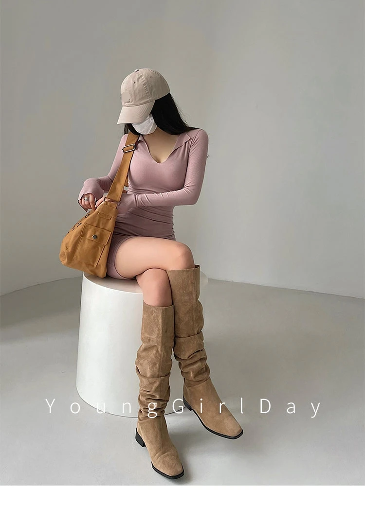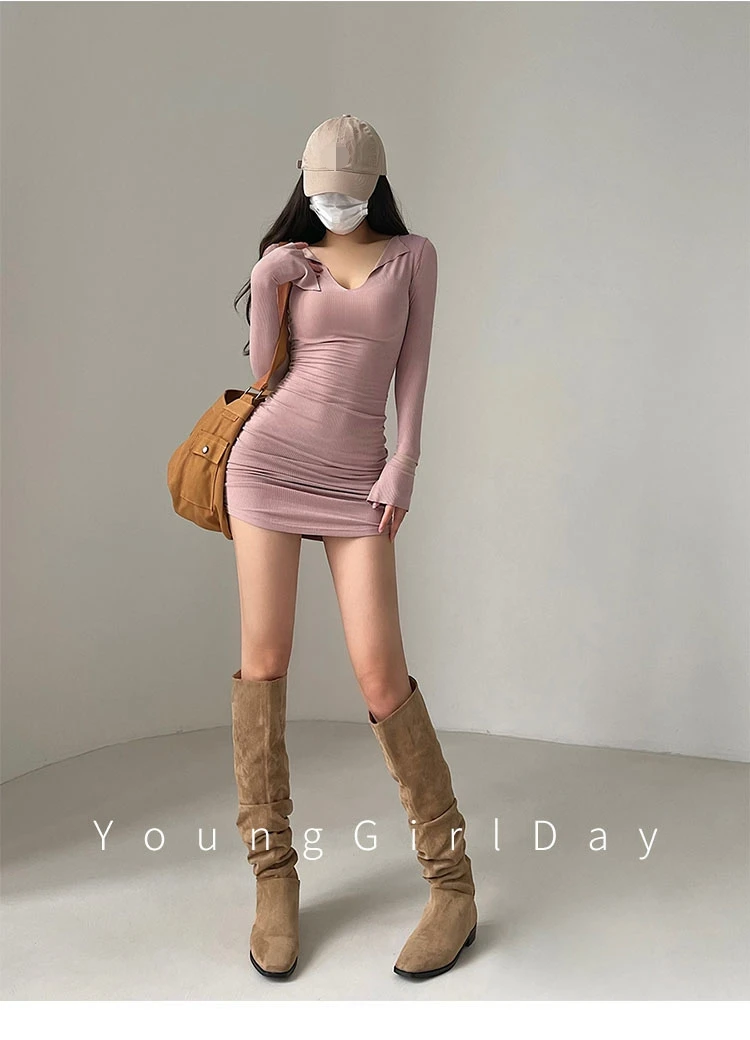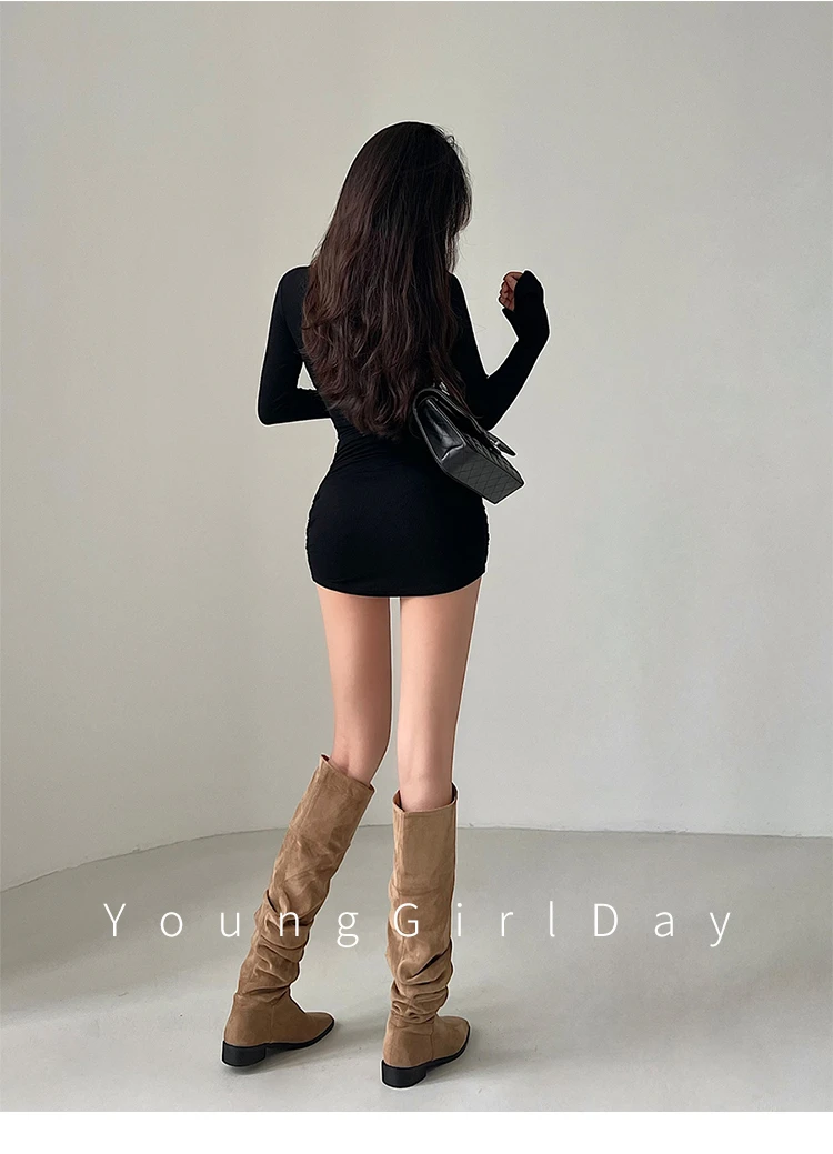 Black Ribbed Mini Dresses for Women V Neck Elegant Clothes Long Sleeve Folds Bodycon Dresses Autumn