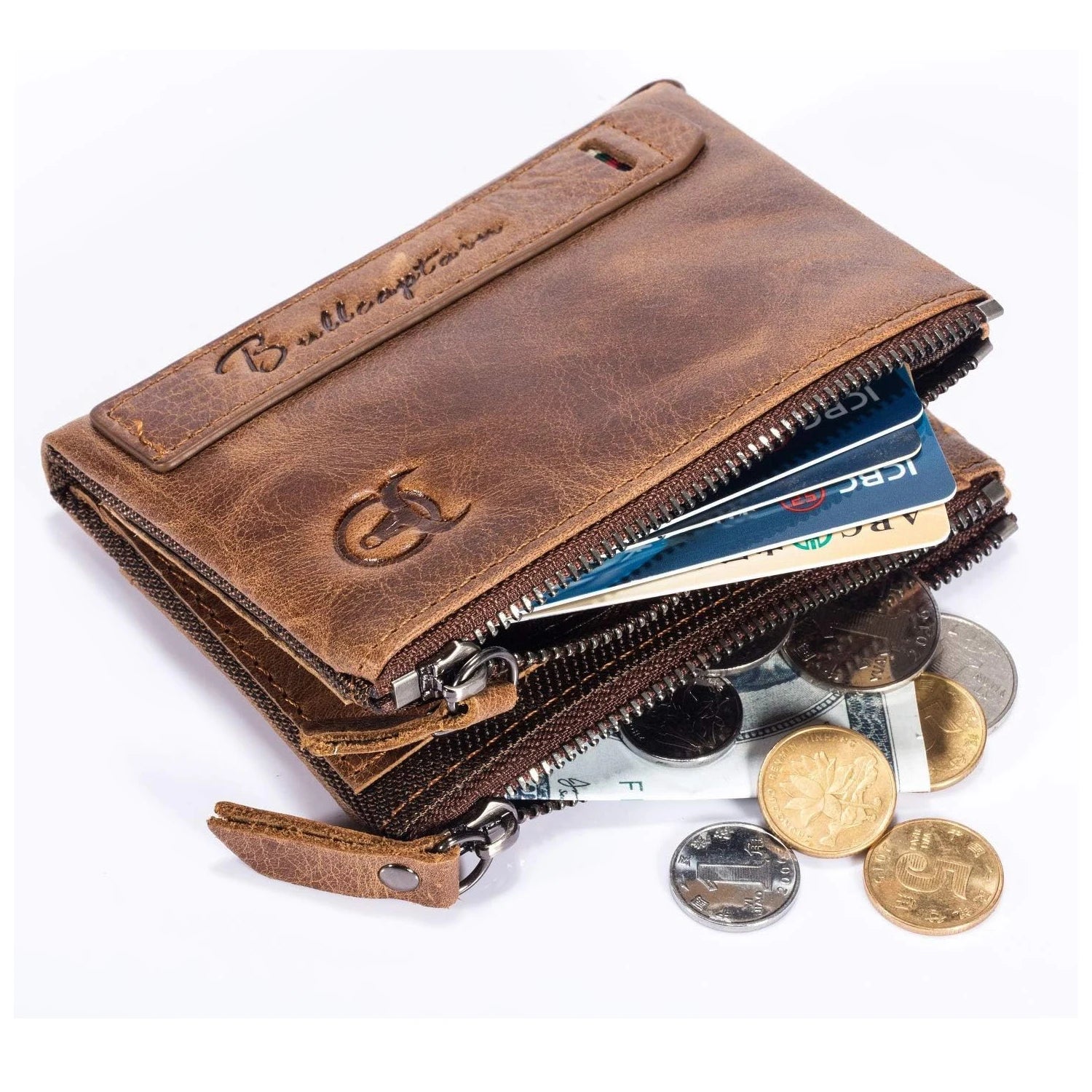 BULLCAPTAIN Genuine Leather Wallet for Men Vintage Bifold with Double Zipper Pockets