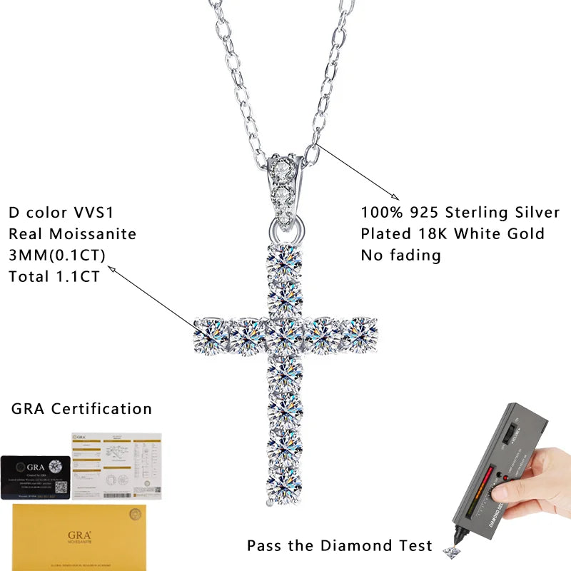 Cross Pendant Necklace for Women D VVS1 Moissanite Pass Diamond Test 100% Sterling Silver Plated 18K White Gold Classic Jewelry
