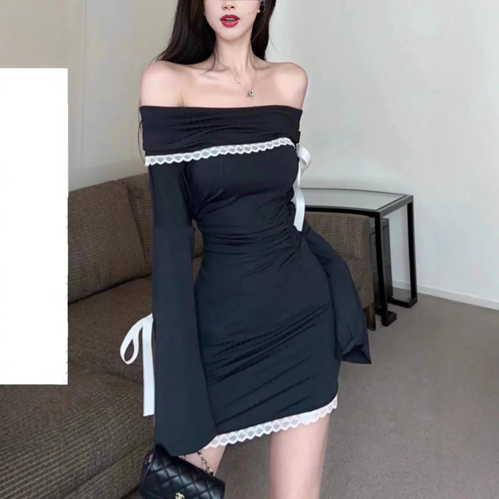 Elegant French Style Lace Splice One Shoulder Long Sleeve Black Dress Women's Sexy Flared Sleeve Bodycon Short Skirt Dress