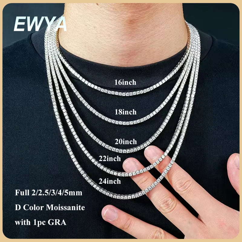 EWYA Real 2-5mm Full D Color Moissanite Tennis Neck Chain Necklace for Woman Man 925 Silver GRA Certified Party Bridal Necklaces