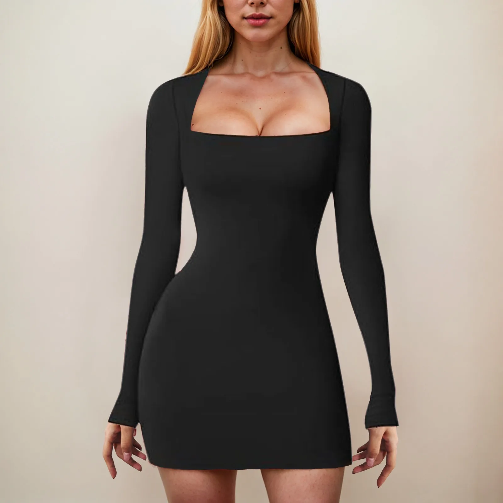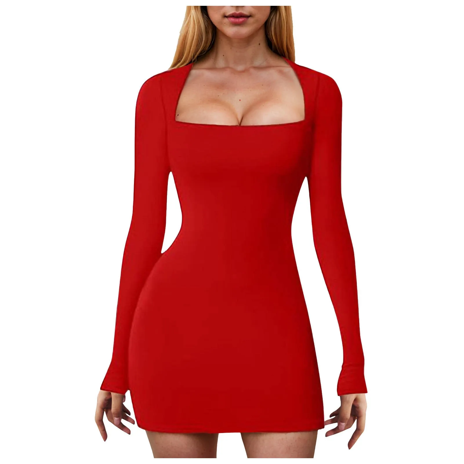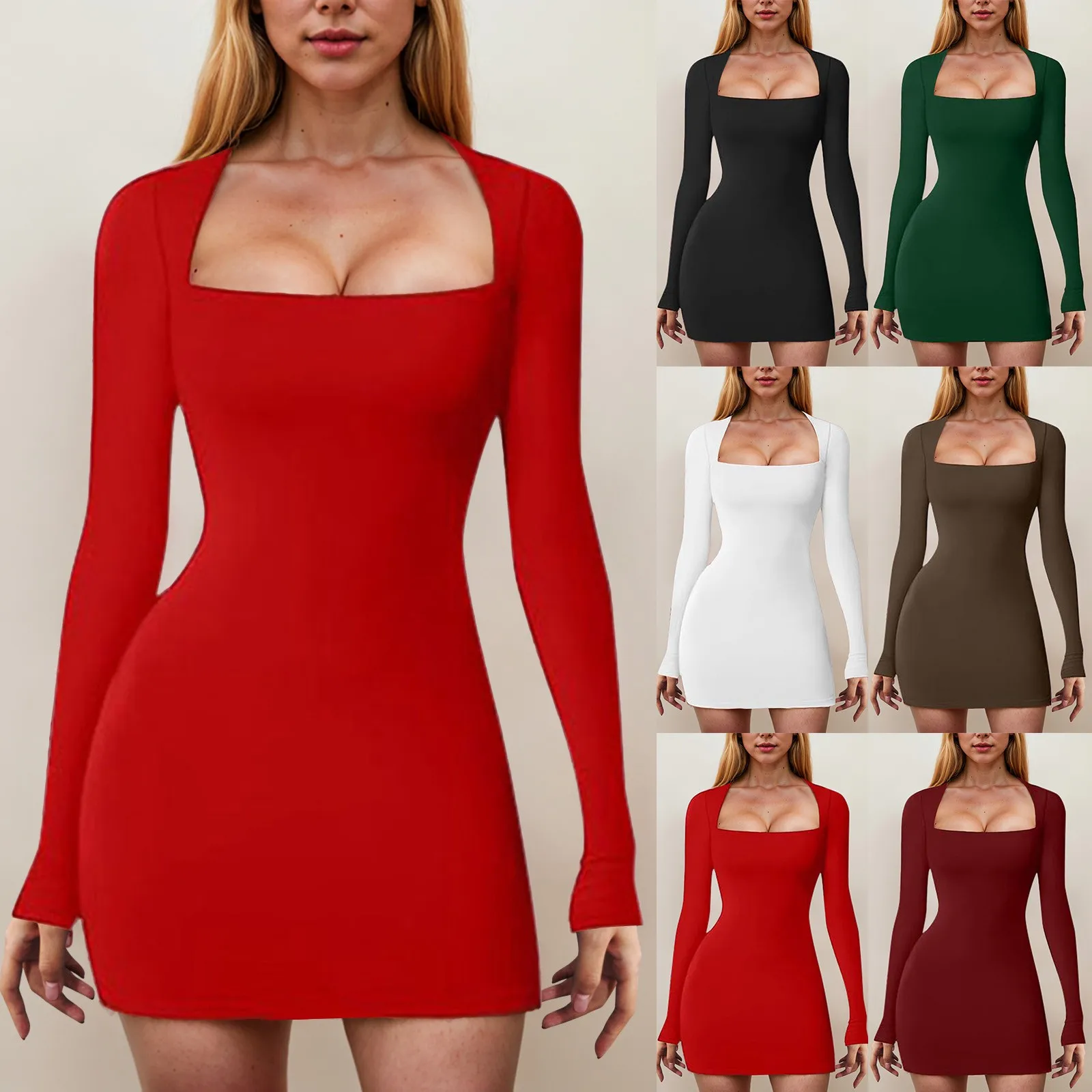 Women Long Sleeve Square Neck Sexy Bodycon Tight Cocktail Party Club Night Formal Short Dress Going Out Outfits