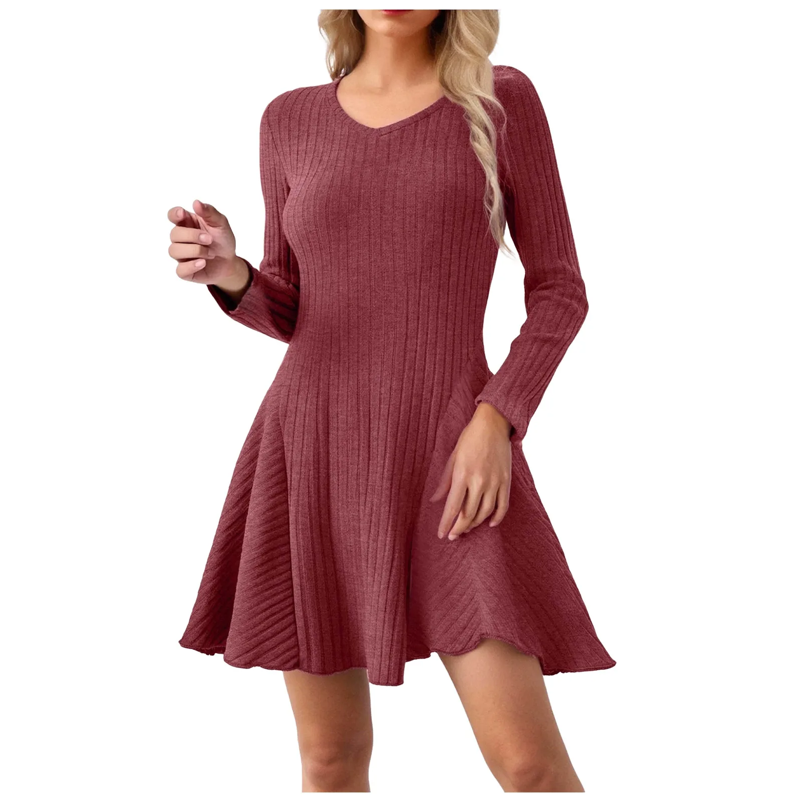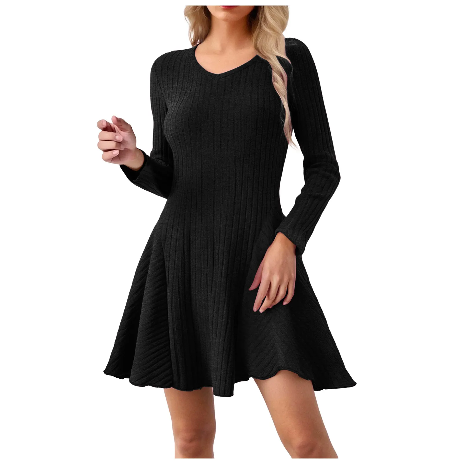 Knitted Mini Dresses Women V Neck Autumn Winter Solid Korean Fashion Vestidos Mujer Elegant Long Sleeve A-Line Women Dress 2025