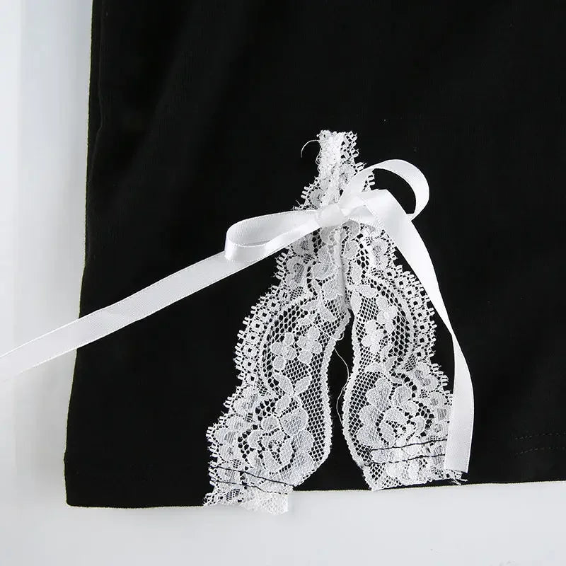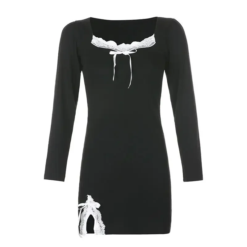 Long Sleeve Dress Women Design Patchwork Lace Bow Square Collar Side-slit A-line Empire Black Sexy Mini Bodycon Dresses Feminine