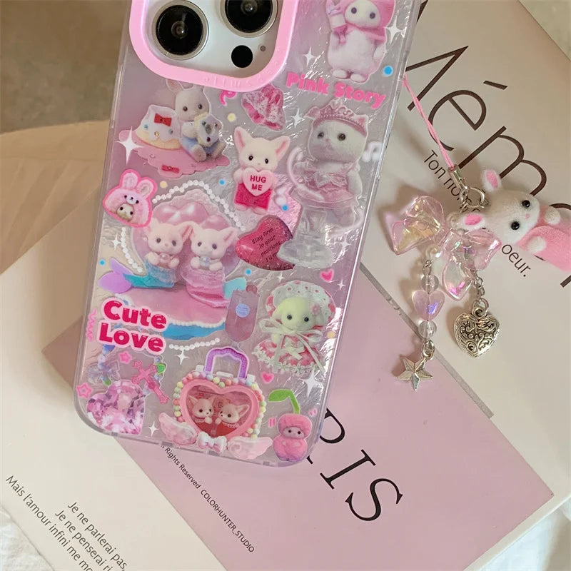 Luxury Laser Rainbow Cute Pink Heart Love Cat Cartoon Phone Case For iPhone 12 13 14 15 16 Pro Max Y2k 3D Furry Cat Doll Lanyard