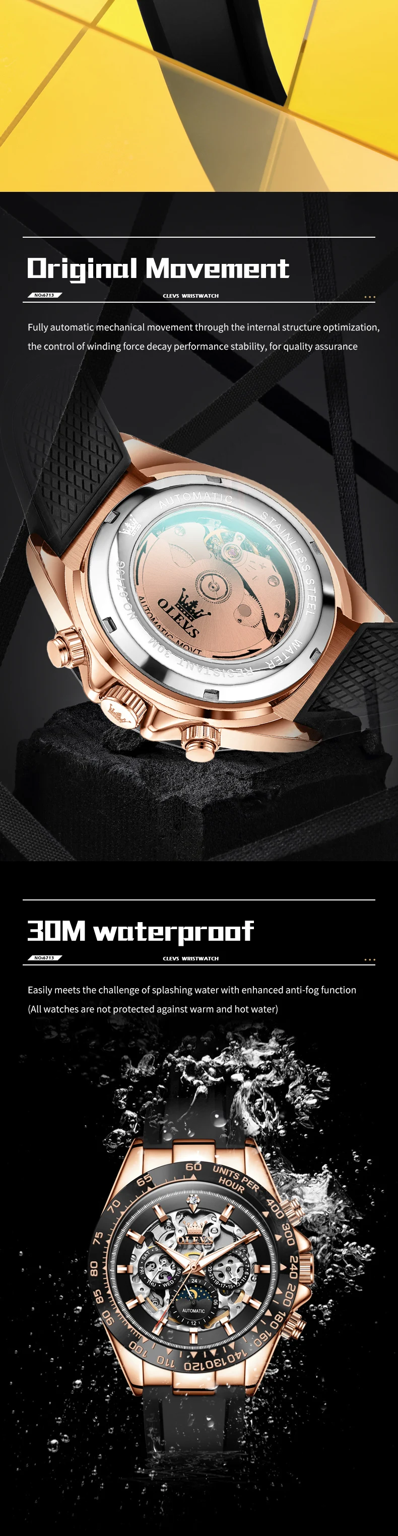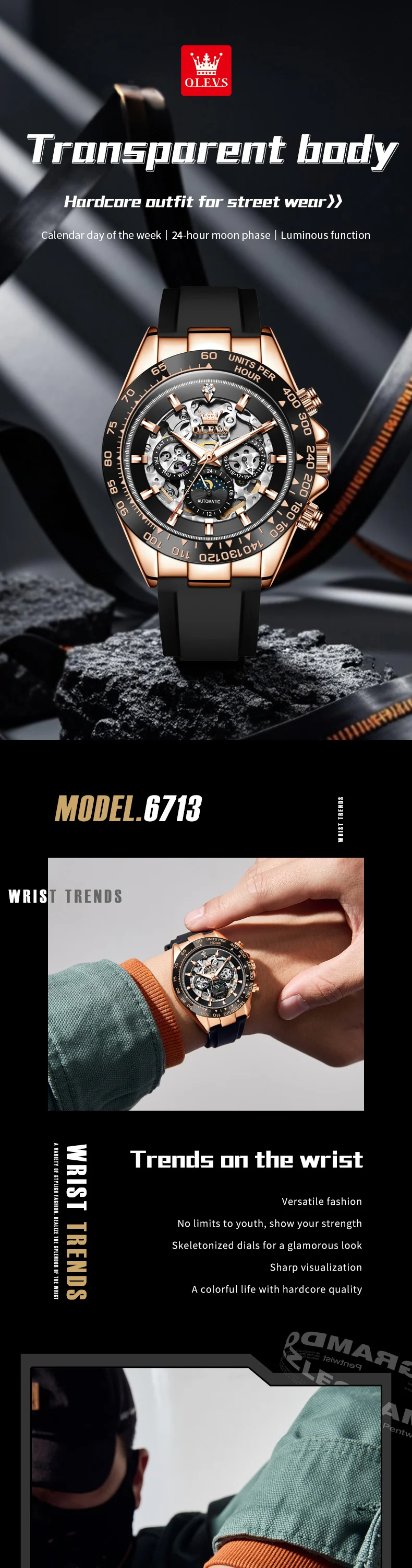 OLEVS 6713 Men Mechanical Watch Hollow Dial Tourbillon Fashionable Business Sport Waterproof Date Moon Silicone Strap