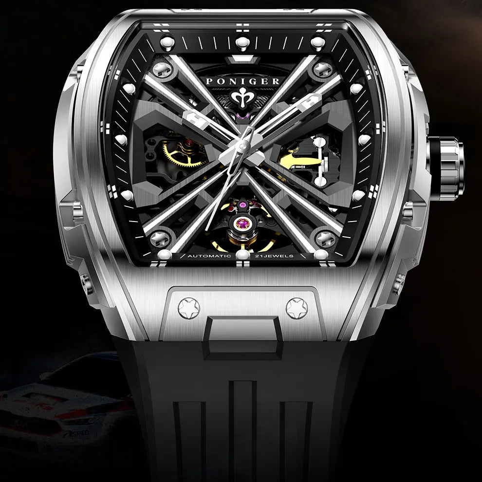 PONIGER New Men's Watch Automatic Movement Mechanical Tourbillon Design Men Watch Stainless Steel Case Waterproof Luminous Watch