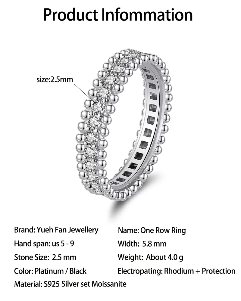 Elevate your accessory game with Yueh Fan Jewellery’sOne Row Ring—a harmonious blend of S925 silver craftsmanship and Moissanite brilliance. Designed for those who crave timeless elegance, this ring is your key to standing out in any crowd.