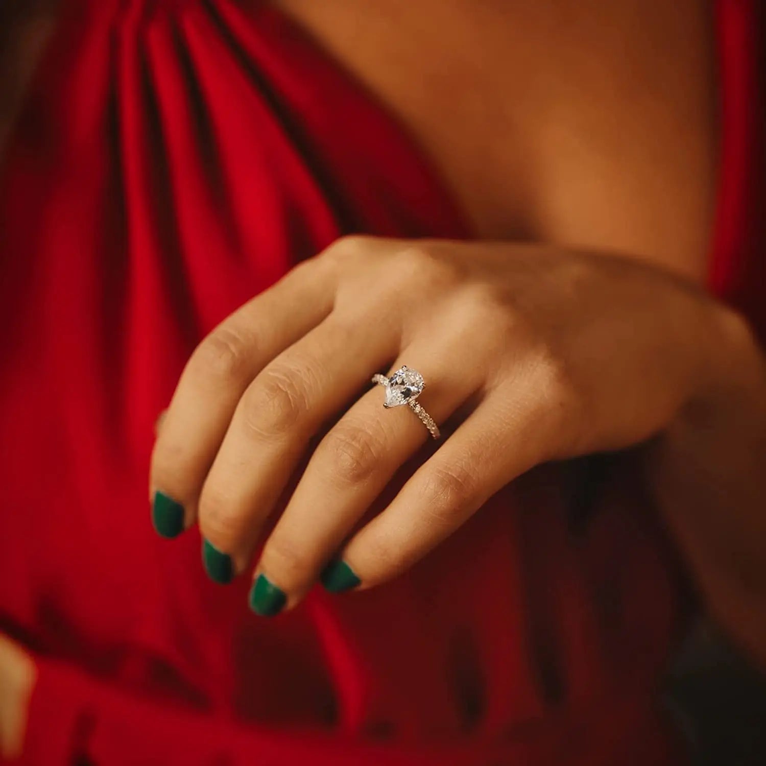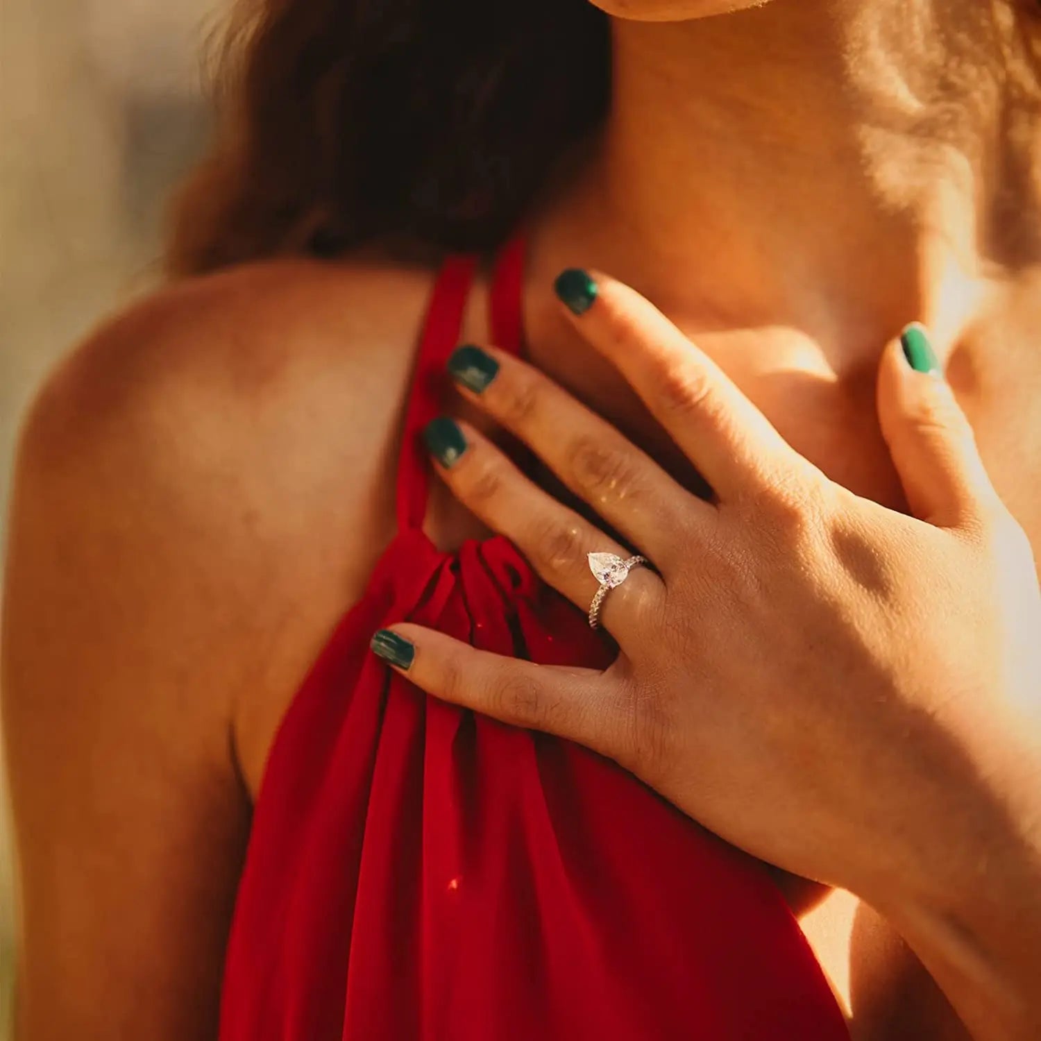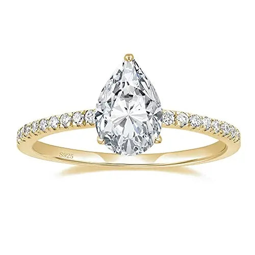 The cubic zirconia ring features a 2 carat pear cut simulated diamond, with plenty of round brilliant stone surrounded. Top quality stones display amazing enriched clarity just like real diamond! This looks like a real diamond ring and the quality of stones has a realistic like shine to them.The center gem is secured in a classic setting and appears to float above the delicate ban