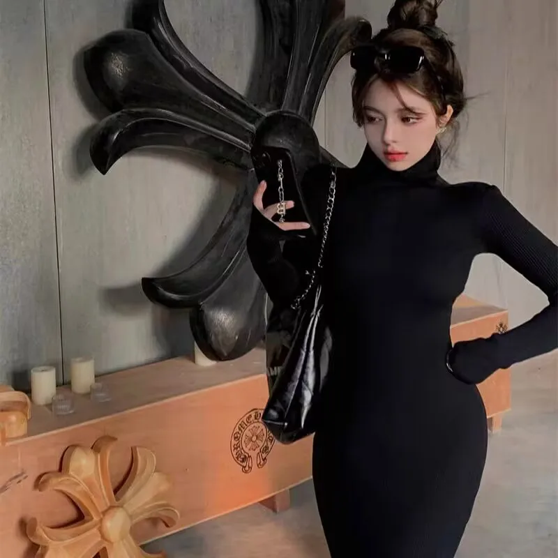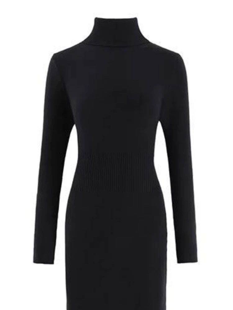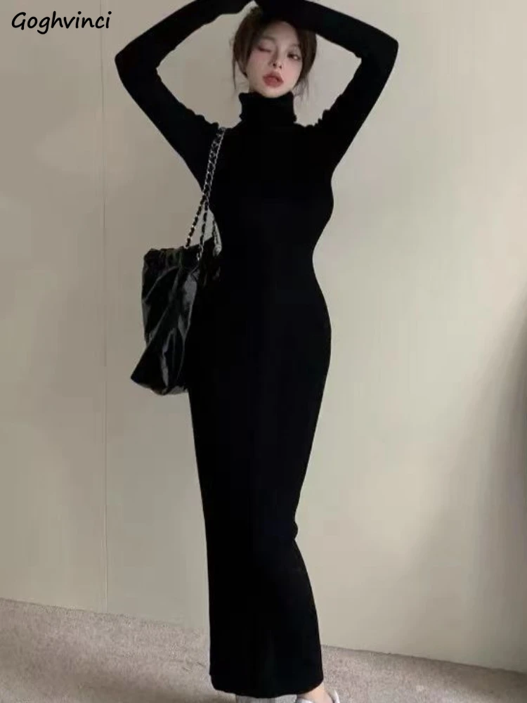 Turtleneck Black Dresses Women Solid Skinny Ladies Clothing Autumn Ankle-length Bodycon Long Sleeve Sexy Warm Fashion Trumpet