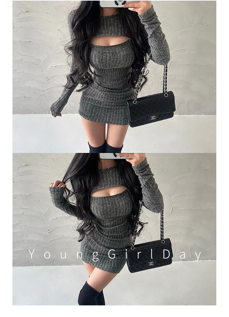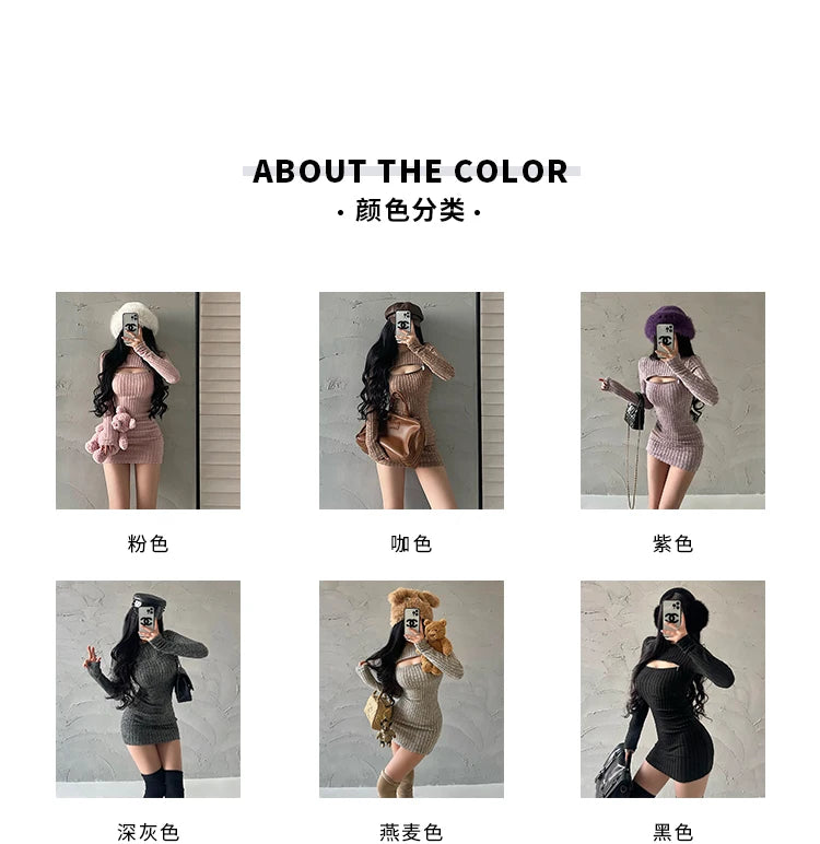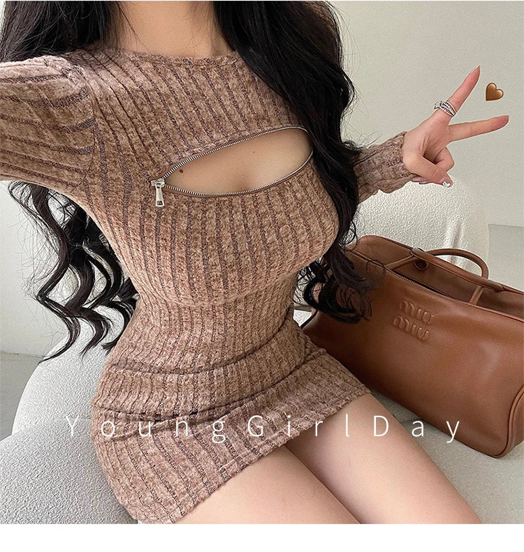 WOMENGAGA Sexy Hollow Zipper Tight Long Sleeved Sweater Knitted Dress Elegant Short Dress Fashion Sweet Kroean Women Top 1S4E