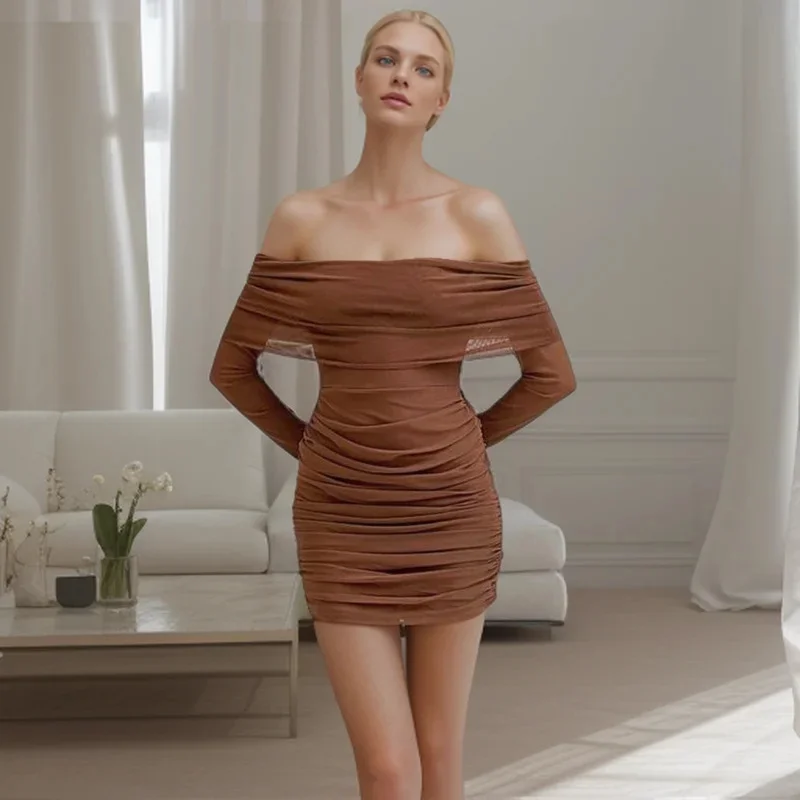 Womens Elegant Evening Cocktail Party Mini Dress Sexy Sheer Mesh Long Sleeve Off Shoulder Ruched Slim Bodycon Night Club Dress