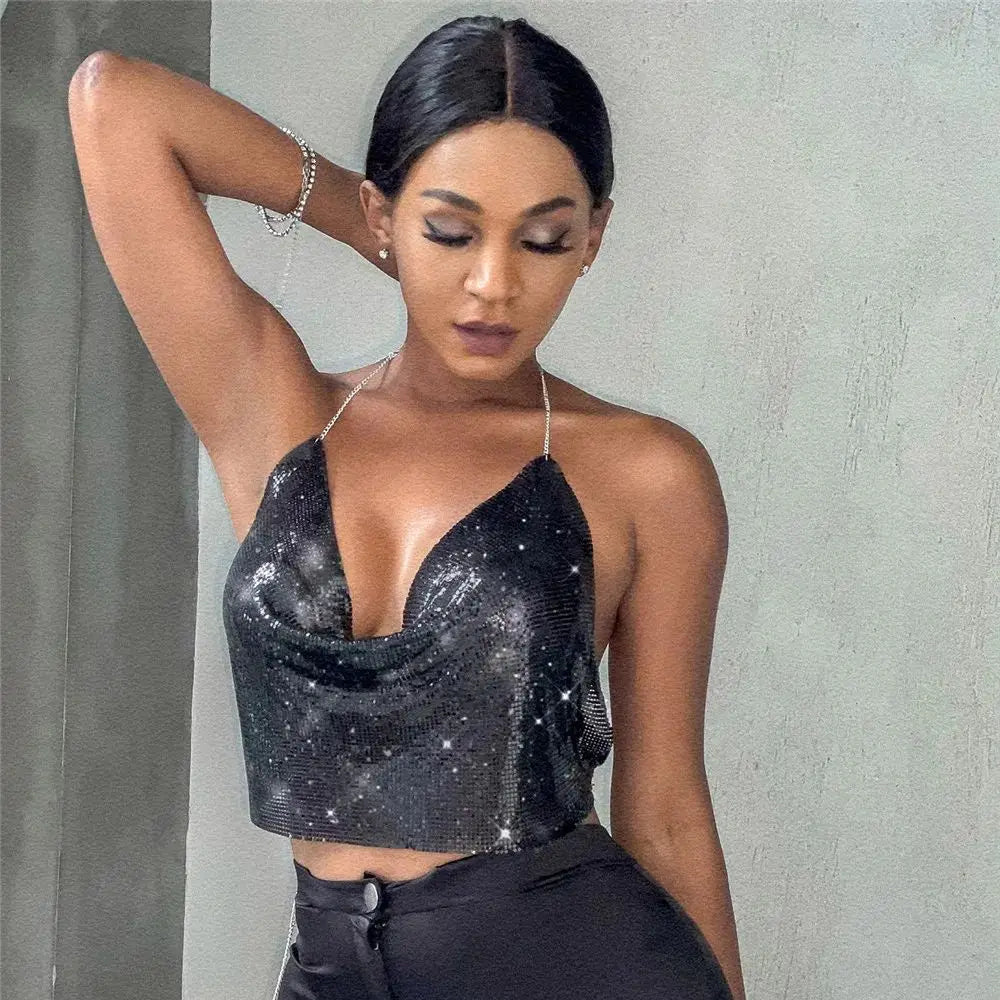 Women's Sexy Metal Sequins Open Back Chain Sling Vest Top Sexy Nightclub Party Tank Tops
