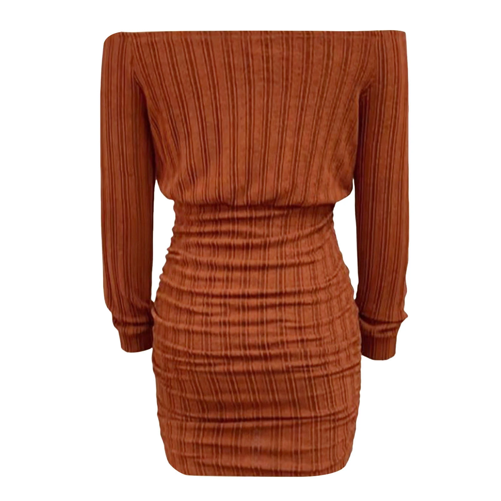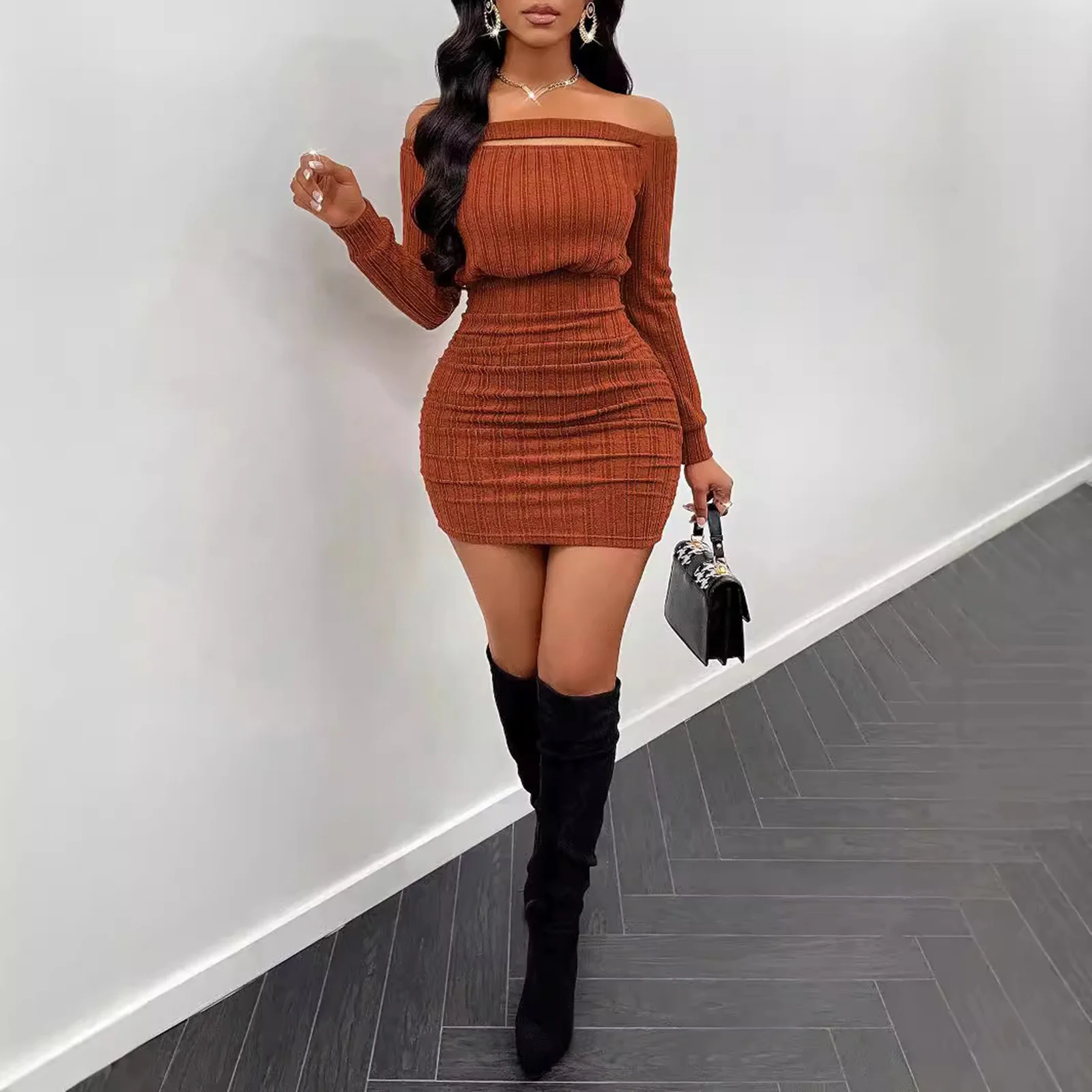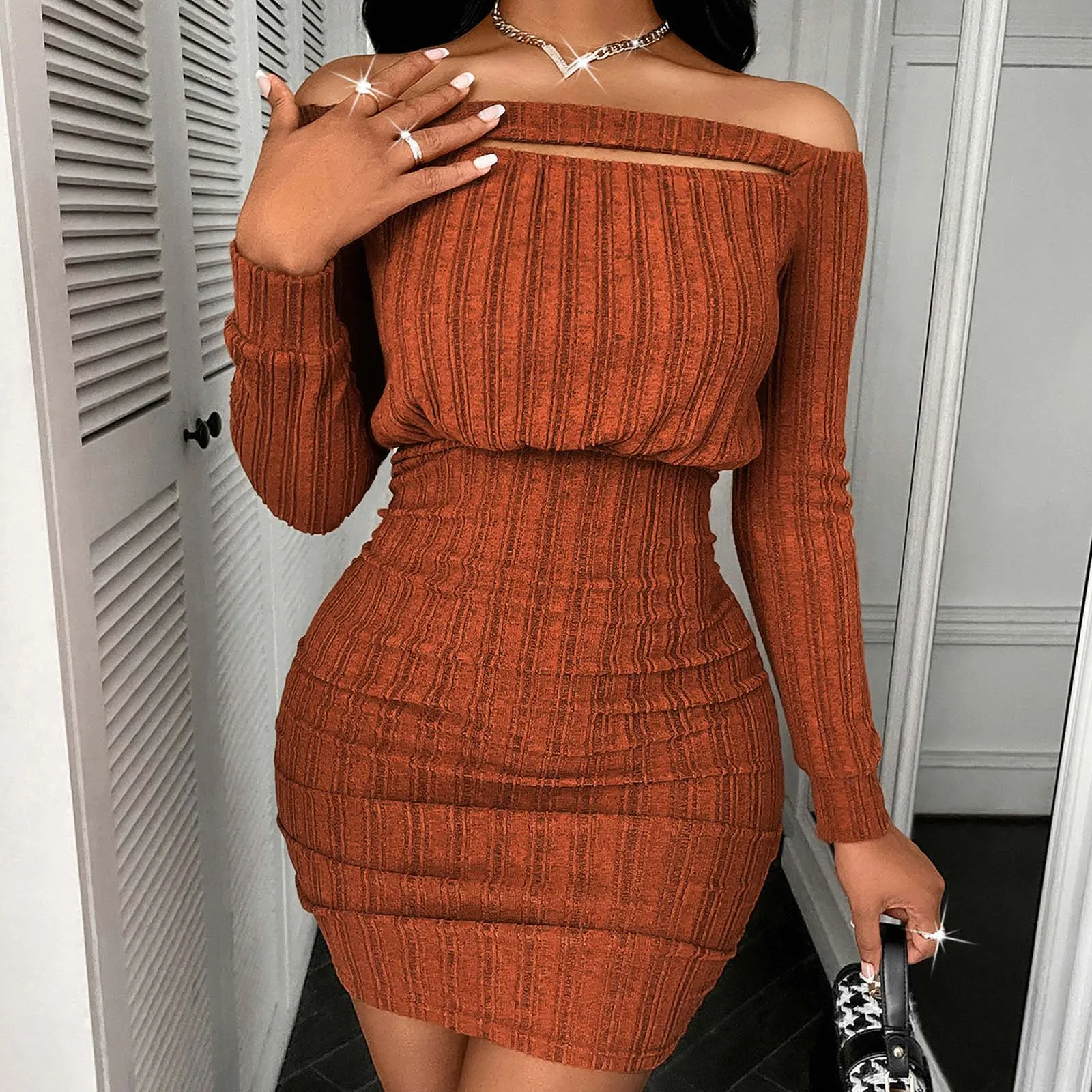 Women's Sexy Off Shoulder Bodycon Mini Dress Solid Color Long Sleeve Ribbed Knit Short Dress Elegant Lady Hip Wrap Party Dresses