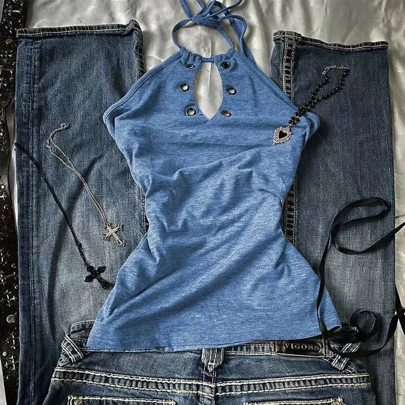 Y2k Camis T Shirt Women Clothes Vintage 90s Streetwear Hip Hop Bandage Blue Tank Top Femme Camis Korea Sling Punk Y2k Crop Tops