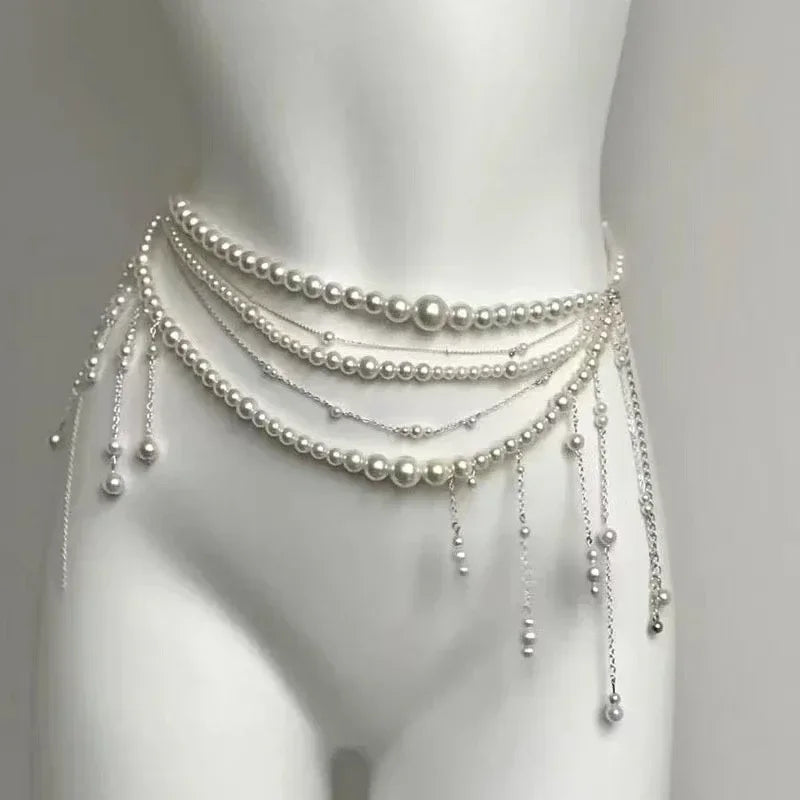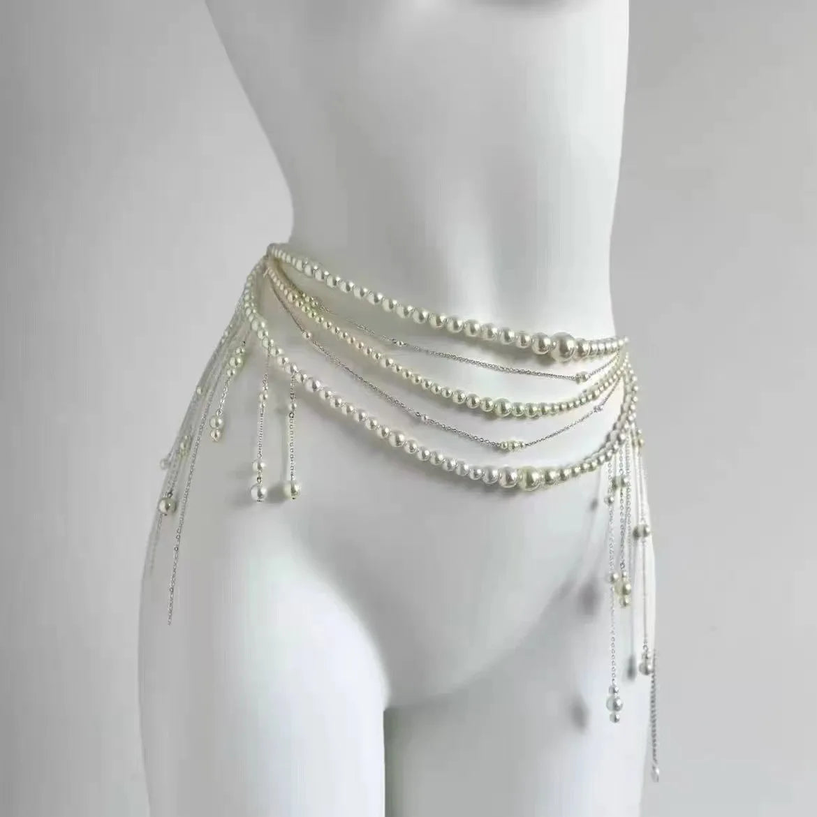 Y2K Designer belt Jewelry Multilayer Pearl waist chain for Women's Fashion Retro Character Playing Body Accessories Party Belts