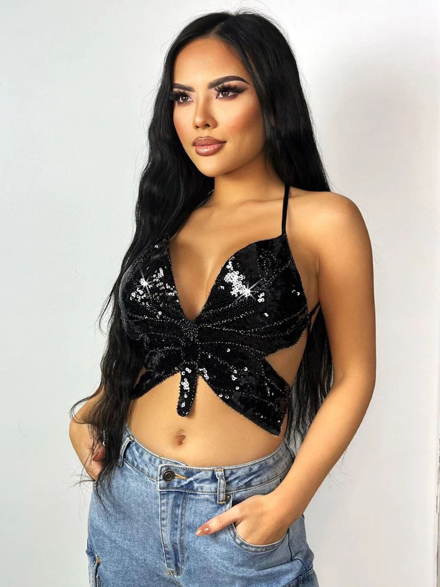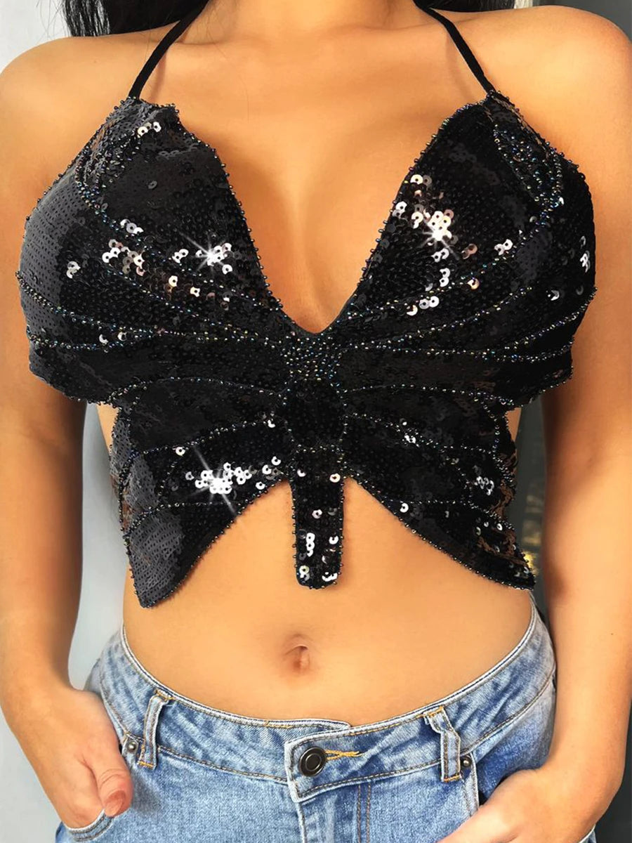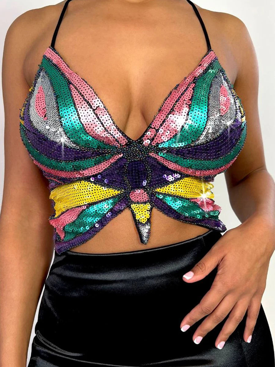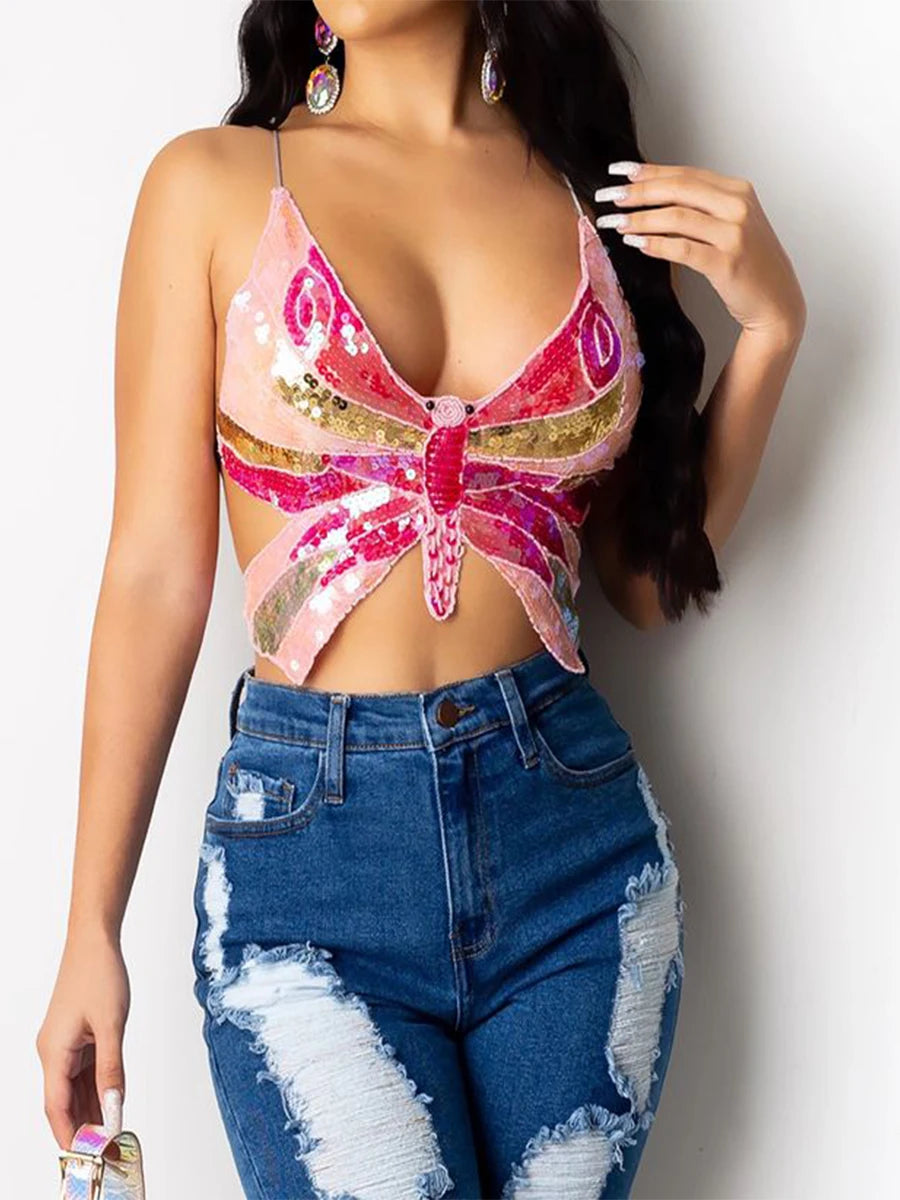 Y2K Summer Pink Halter Backless Sexy Women Fashion Bandage Sequins Butterfly Cropped Cami Top