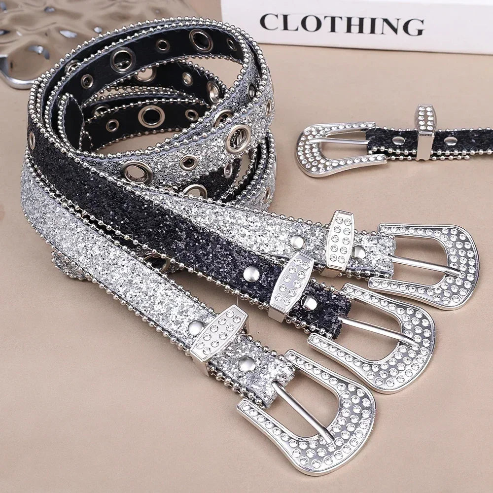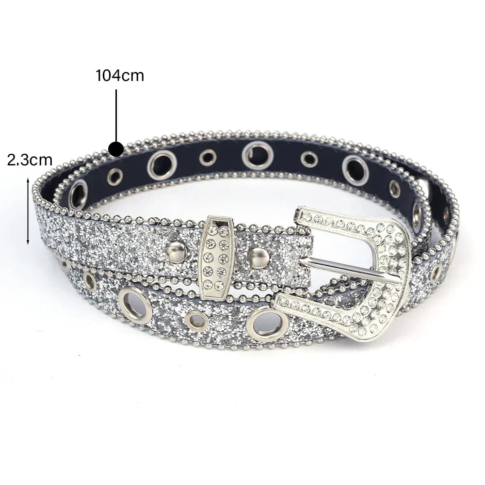 Y2K Women Fashion Solid Print Studded Full Rhinestone Belt PU Leather Bling Crystal Adjustable Glitter Waistband for Club Party