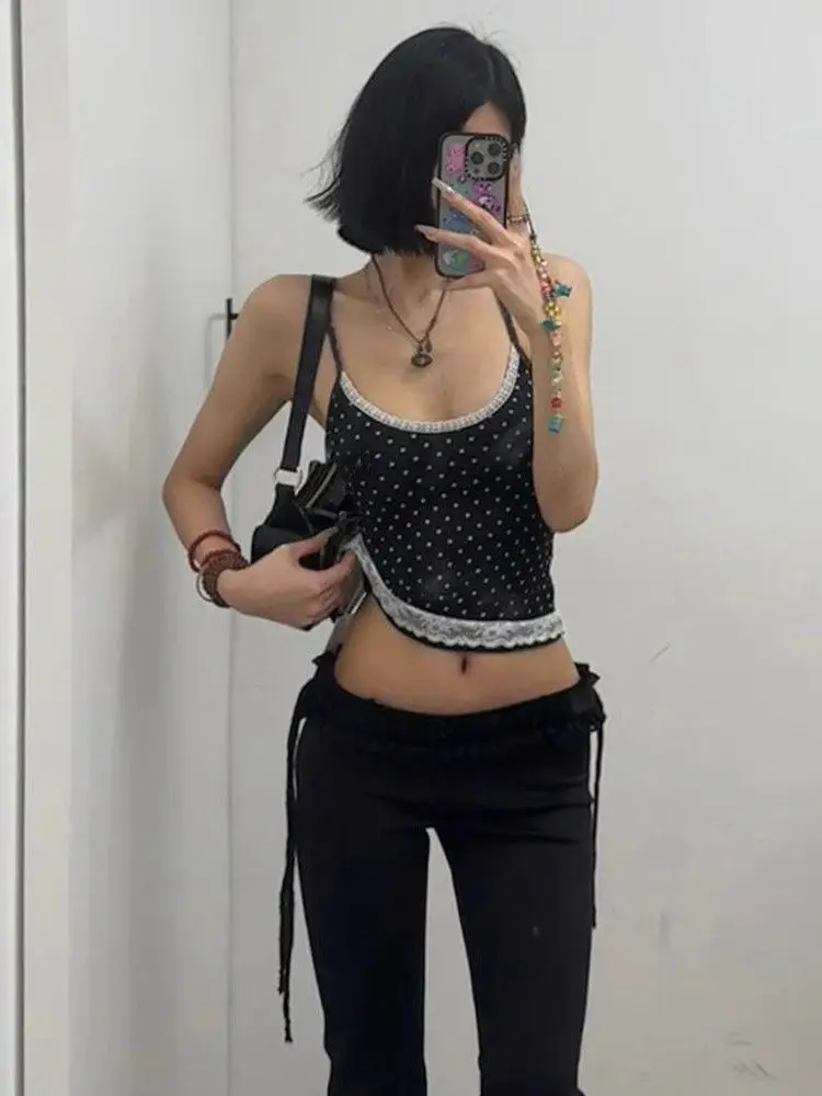 Yedinas Dot Patchwork Lace Halter Tops Sleeveless Tshitrs Tank Tops Summer Camisole Women Clothes Sexy Streetwear Y2k Chic