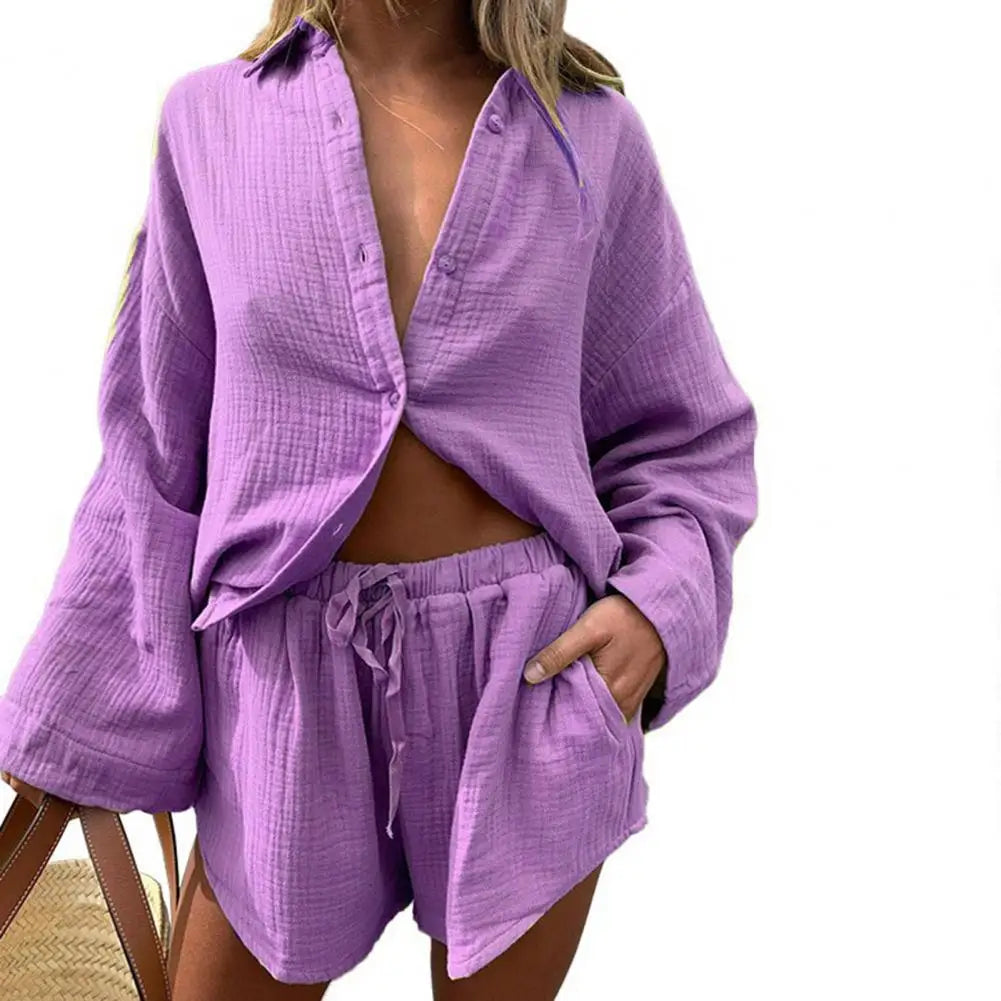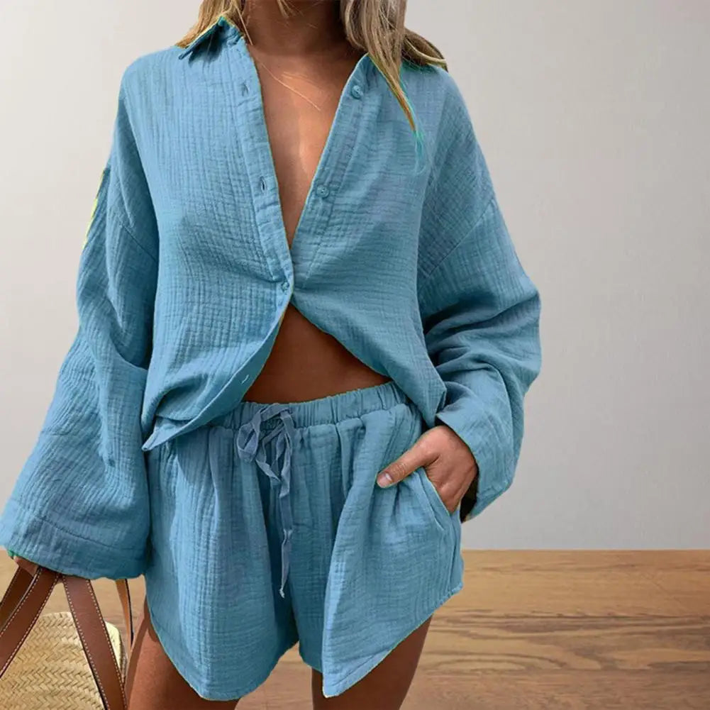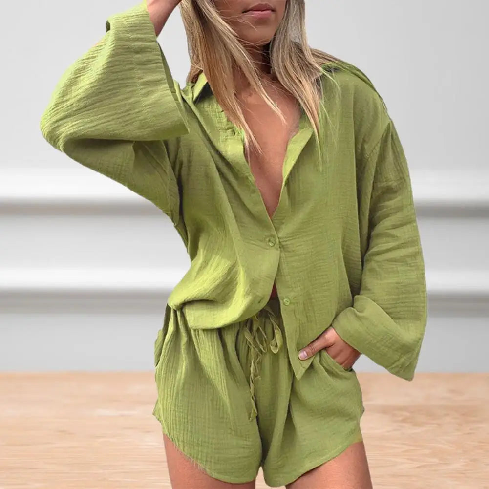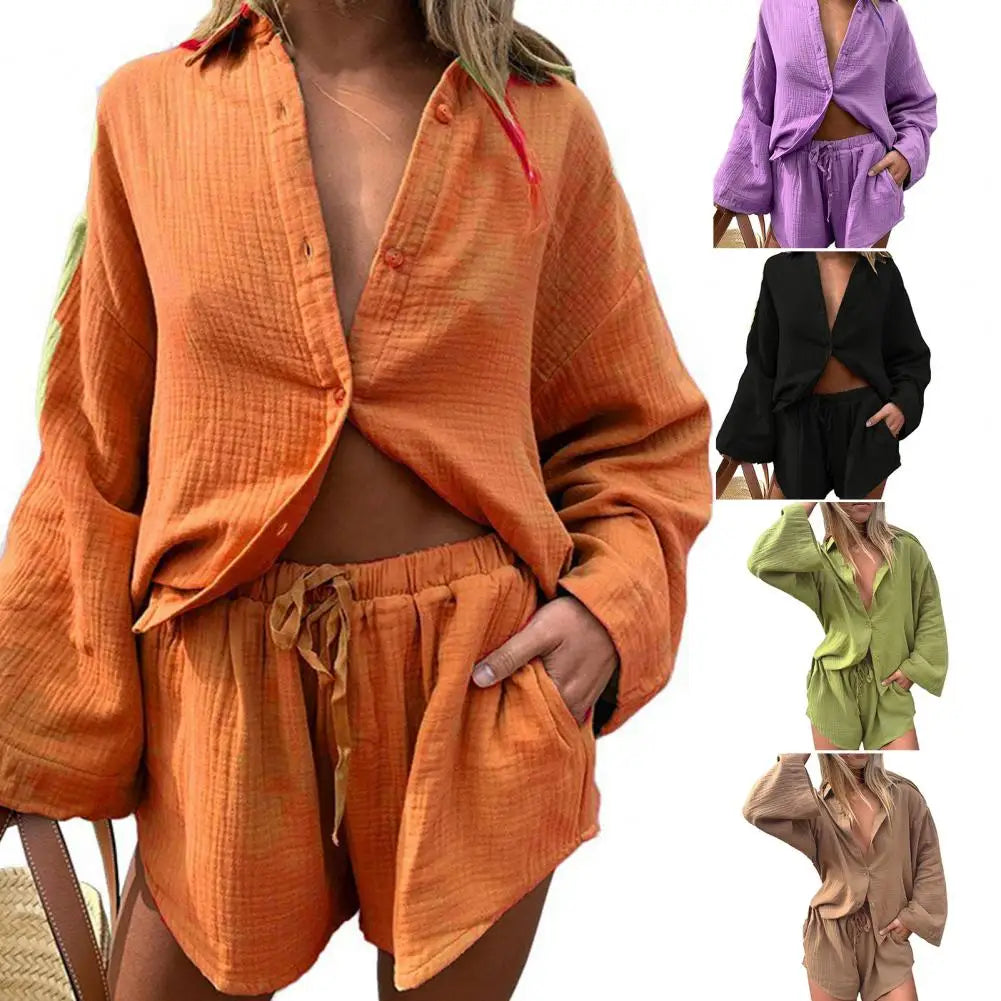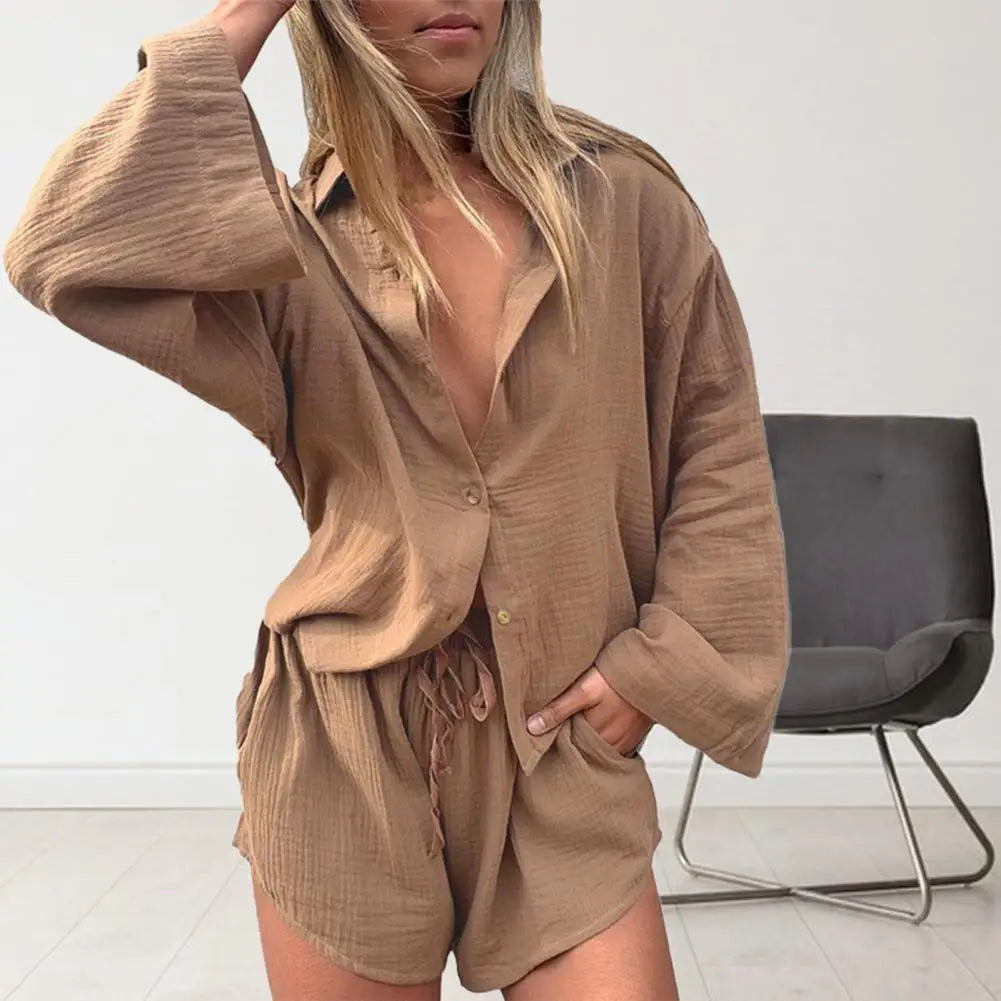 2 Pcs/Set Women Blouse Pants Set Solid Color Turn-down Collar Elastic Waist Deep Crotch Fall Shirt Shorts Suit Female Clothes