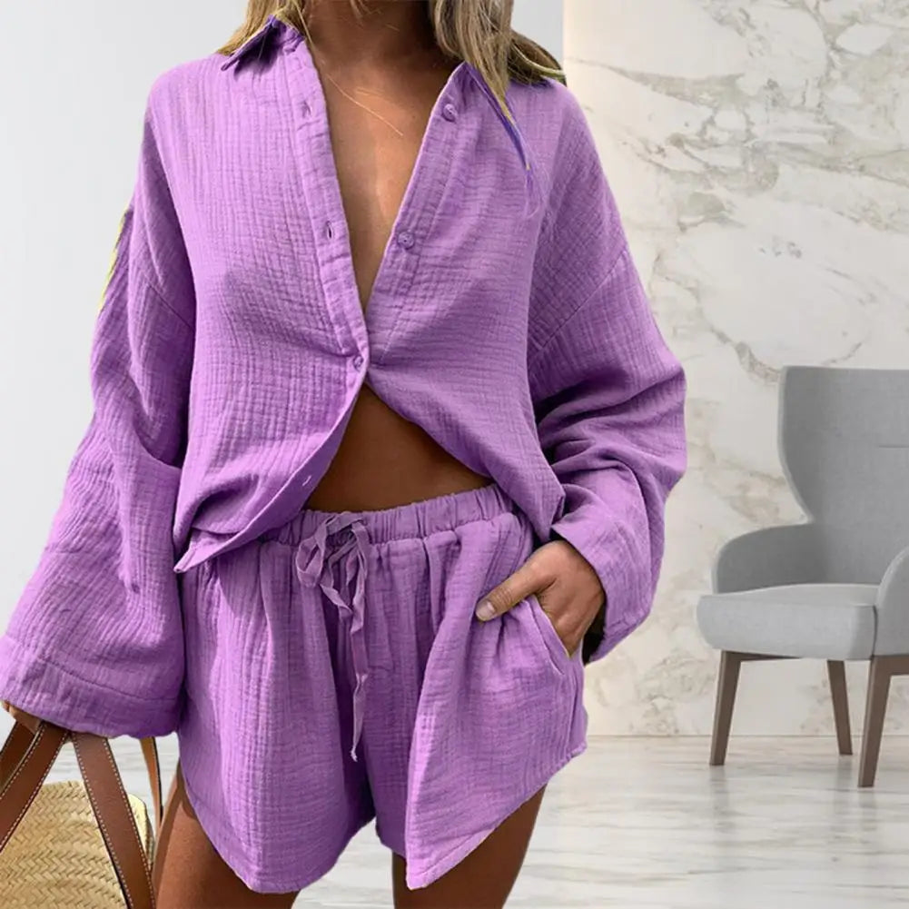 2 Pcs/Set Women Blouse Pants Set Solid Color Turn-down Collar Soft Fabric Elastic Waist Deep Crotch Fall Shirt Shorts Suit Female Clothes