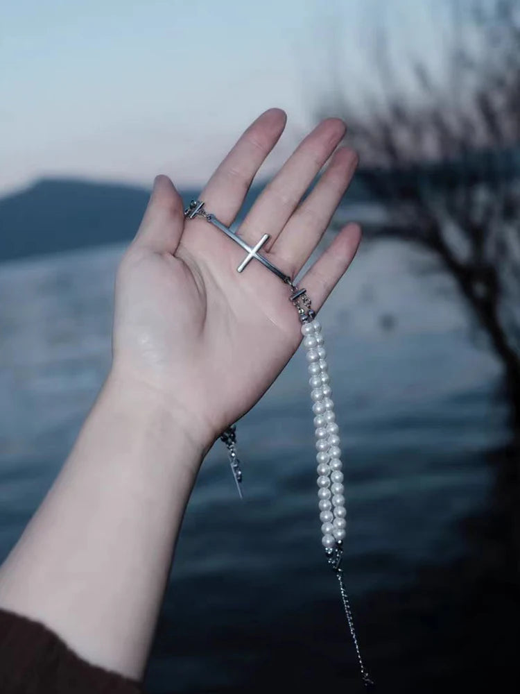 2024 New Pearl Cross Necklace Beaded Punk Cool Unisex Couple Trendy Neck Accessories Choker for Women Men Jewelry