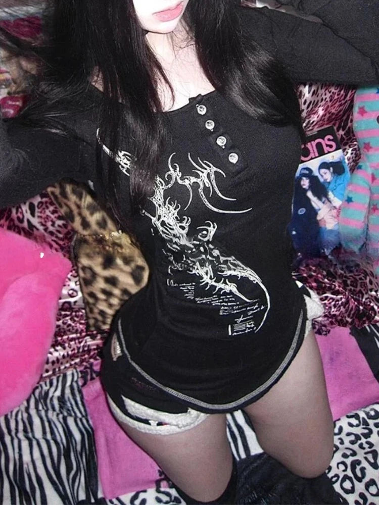 American Vintage Print T-shirt Women Aesthetic Punk Design Long Sleeve Gothic Y2k Tops Subculture Casual Retro Harajuku Tees