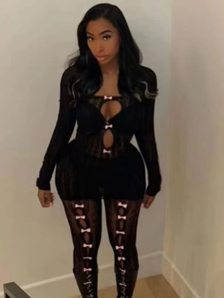 Weird Puss Sexy Butterfly Dress+Shawl Women Y2K Hollow Jacquard Coquette Autumn Trend Stretch Clubwear Long Sleeve Mini Bodycon