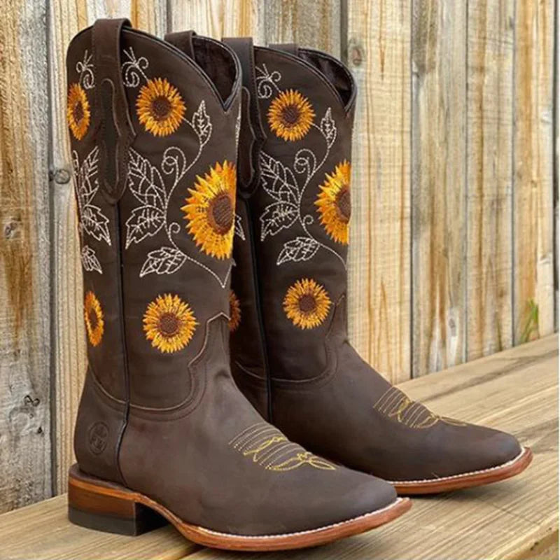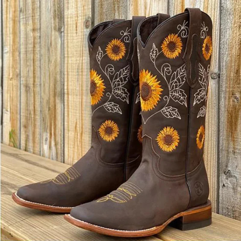Winter Women Fashion Boots Outdoor Comfort walking shoes Embroidery Brown Leather Boots Deep High Tube female Casual shoe Botas