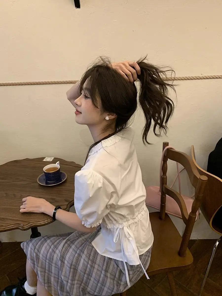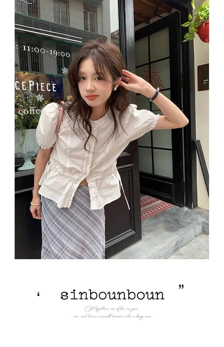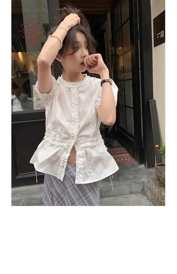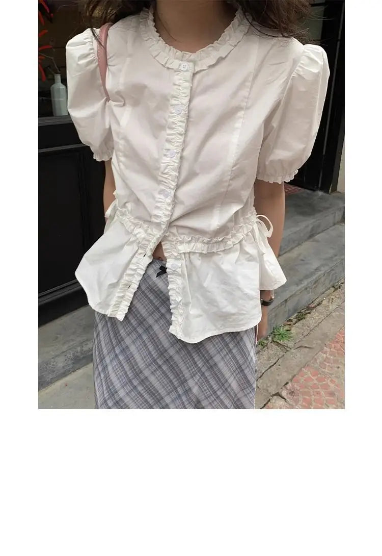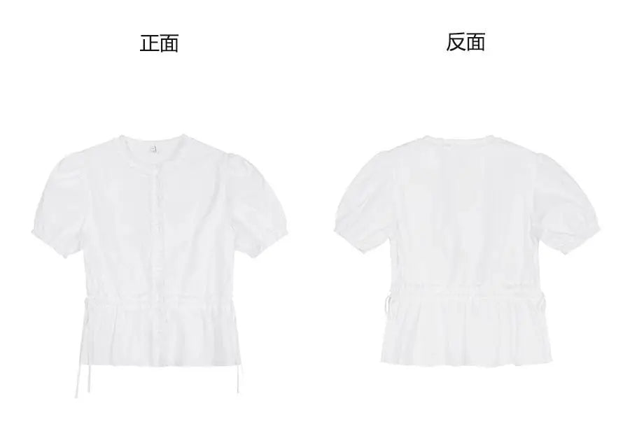 Women French Gentle Style Fungus Edges O-neck Puff Short-sleeved Shirts Summer Lace-up Bow Waist Slimming Single Breasted Blouse