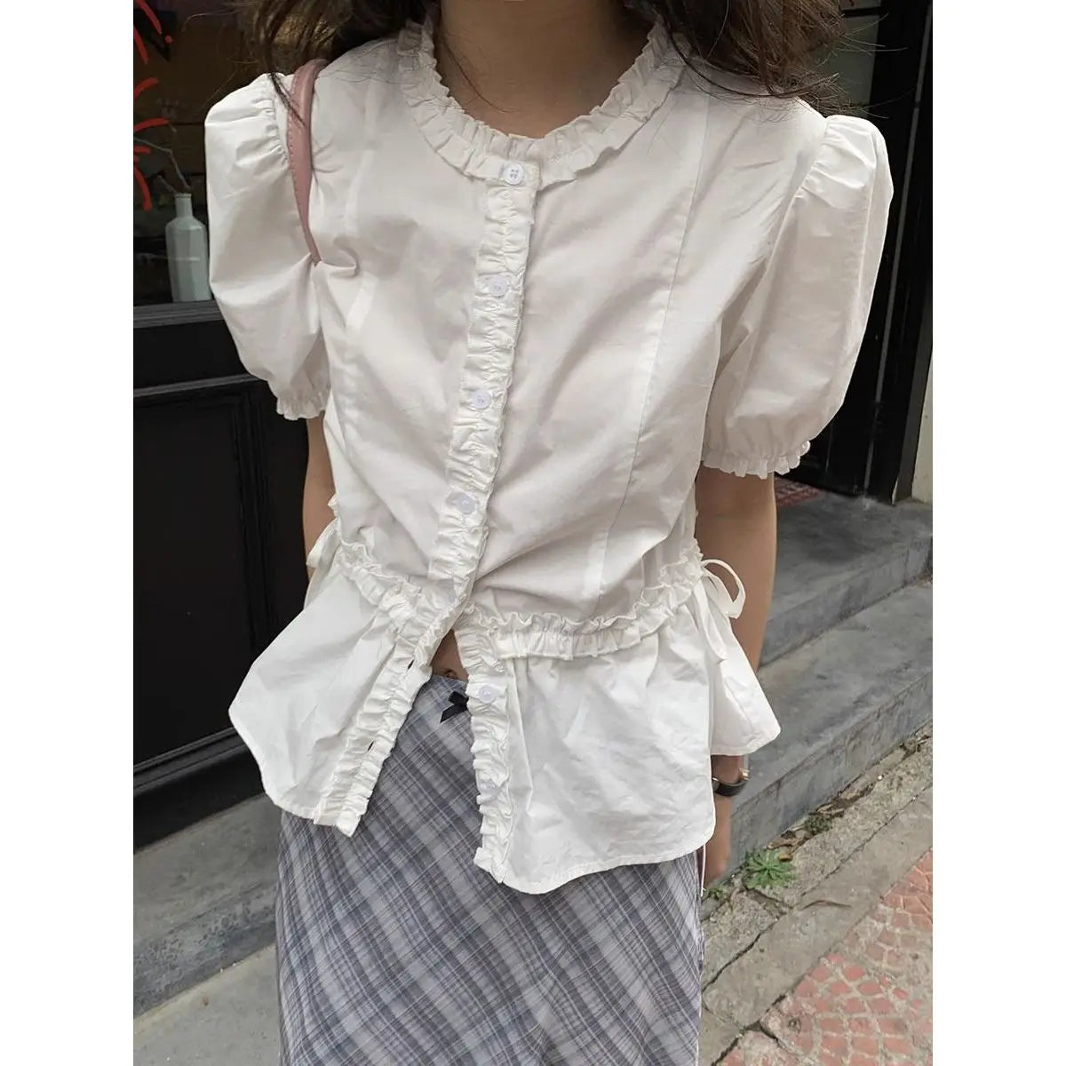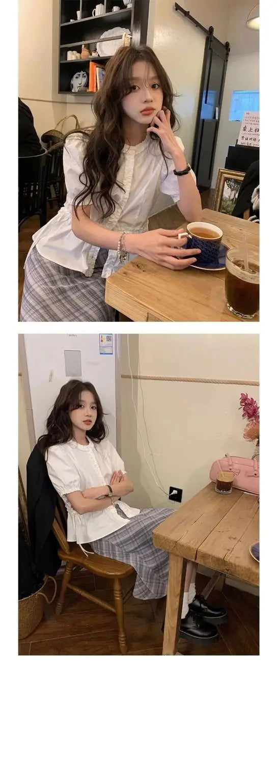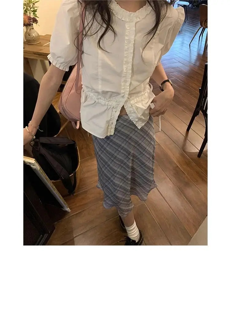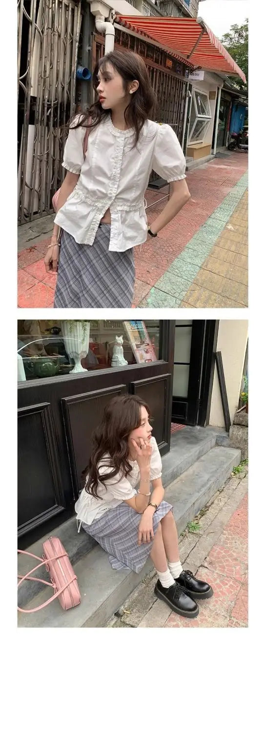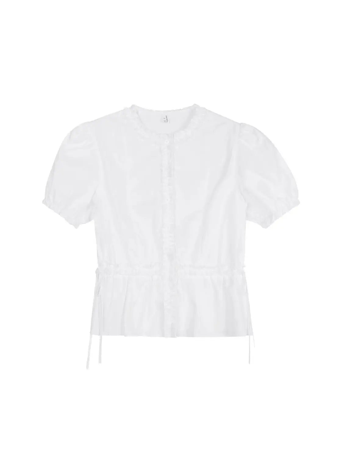 Women French Gentle Style Fungus Edges O-neck Puff Short-sleeved Shirts Summer Lace-up Bow Waist Slimming Single Breasted Blouse