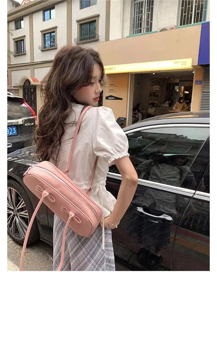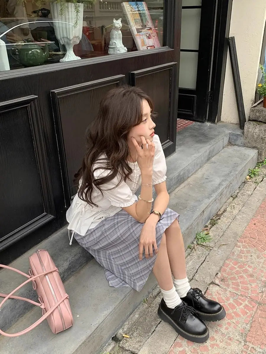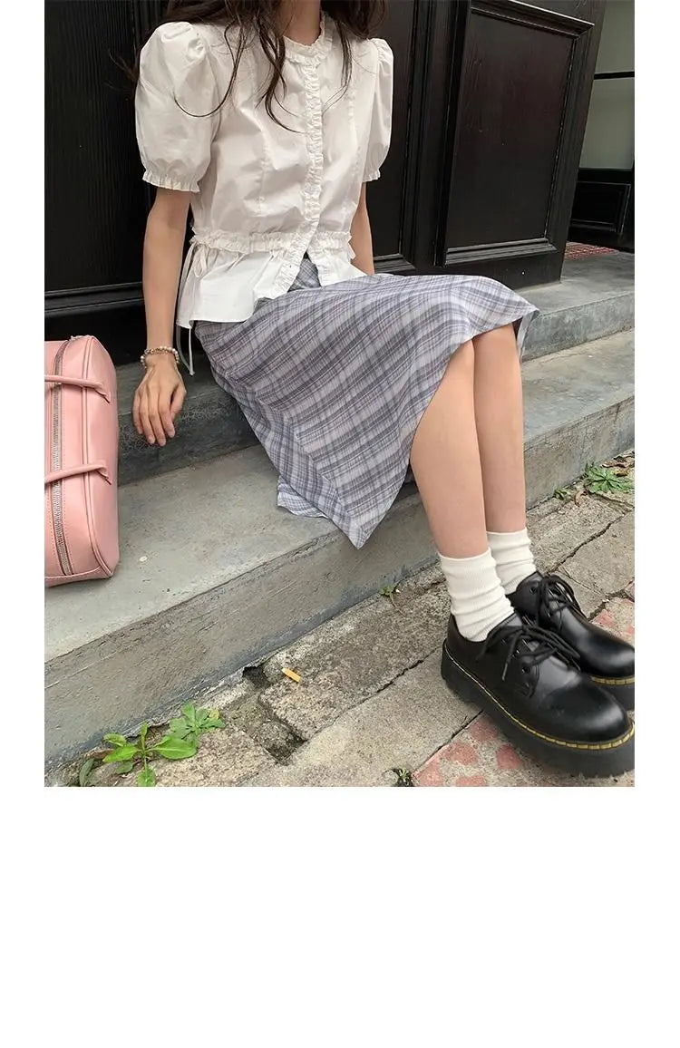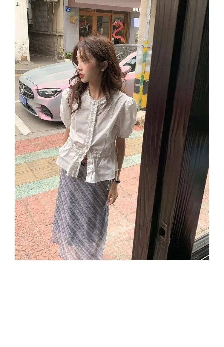 Women French Gentle Style Fungus Edges O-neck Puff Short-sleeved Shirts Summer Lace-up Bow Waist Slimming Single Breasted Blouse