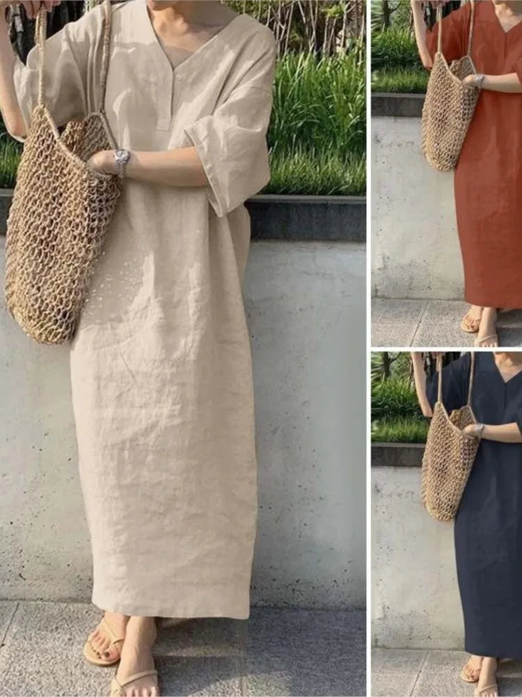 Women V Neck Button Short Sleeve Loose Maxi Dresses Summer Casual Female Holiday Beachwear Solid Color Cotton Linen Party Dress