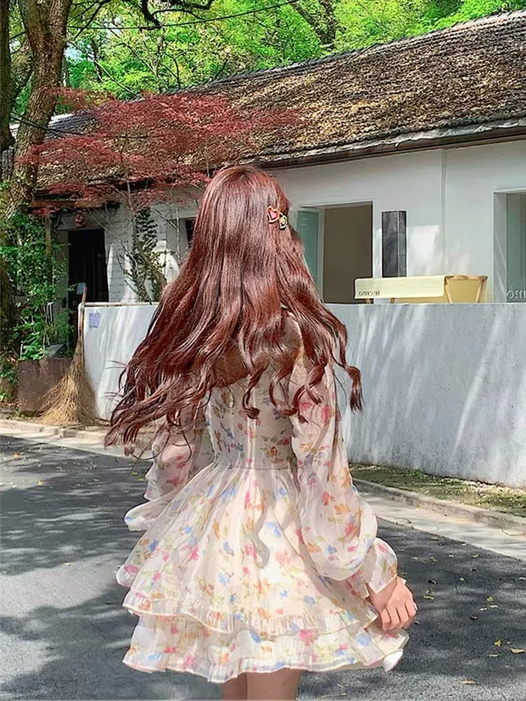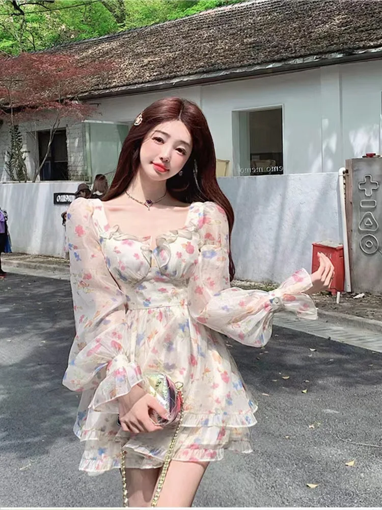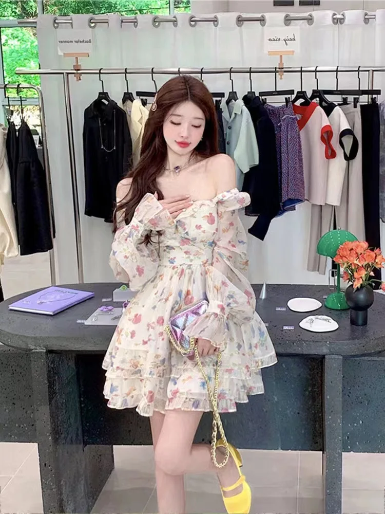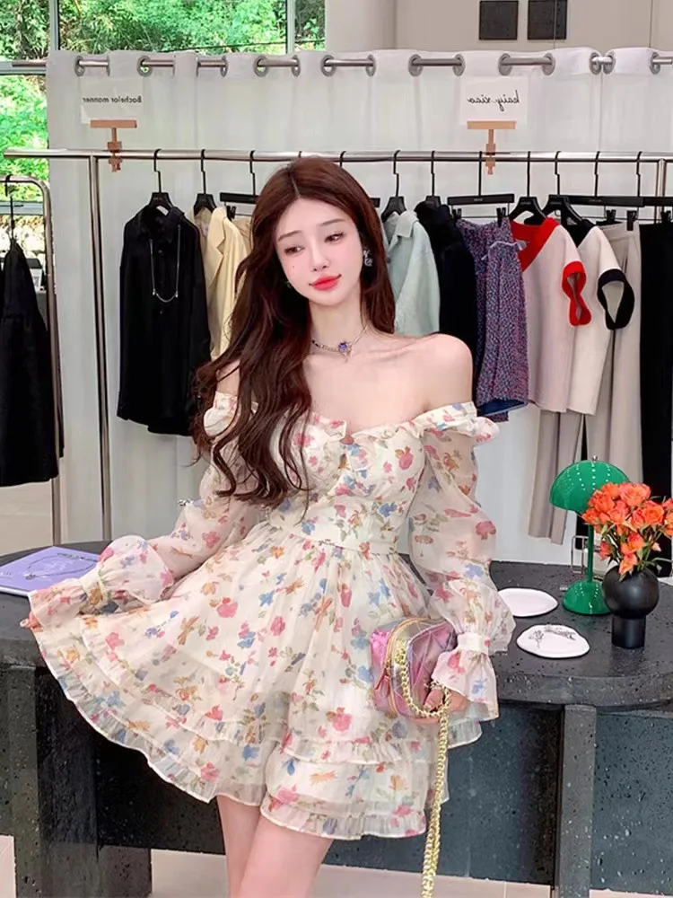 Women's Dresses Off Shoulder Floral Printed Long Sleeve Ruffles Party Mini Dresses Ruffle Slim Short Dresses Fairy Sweet