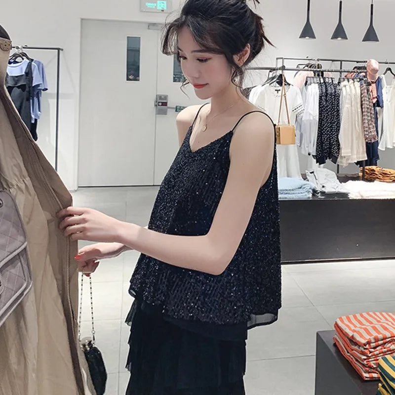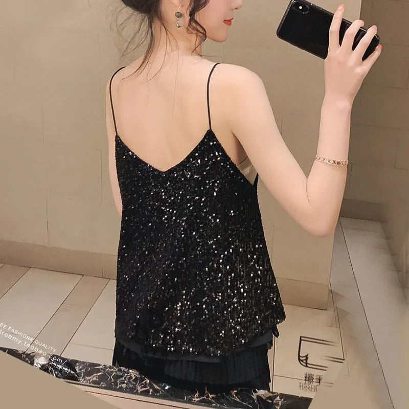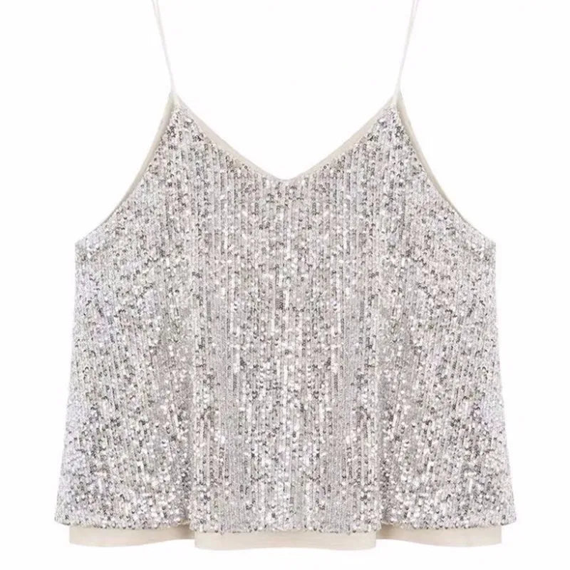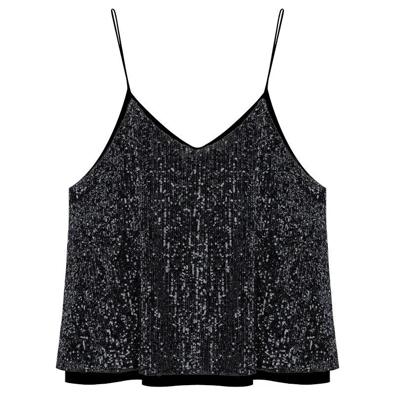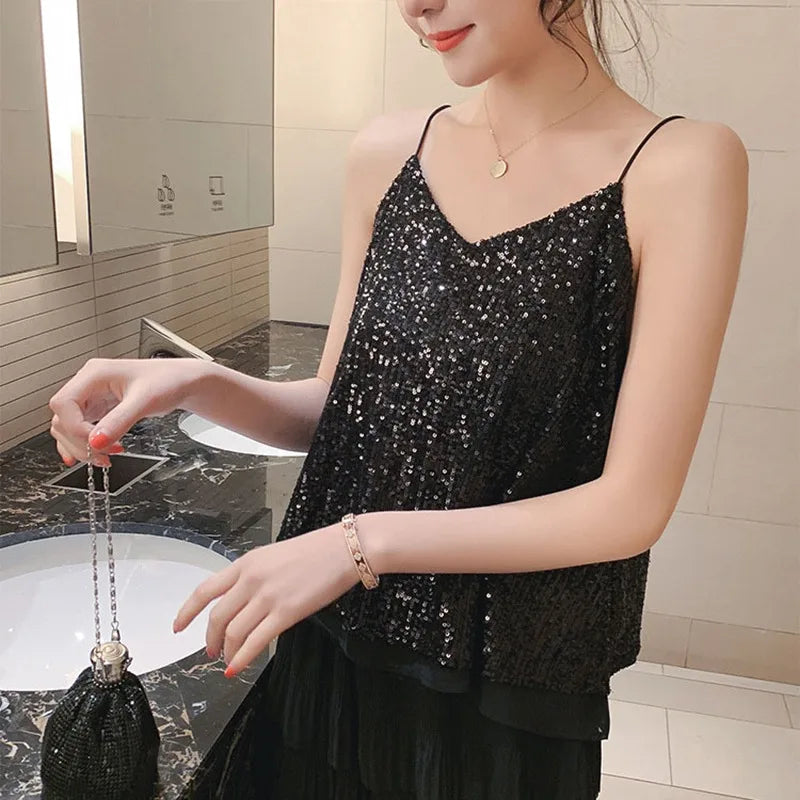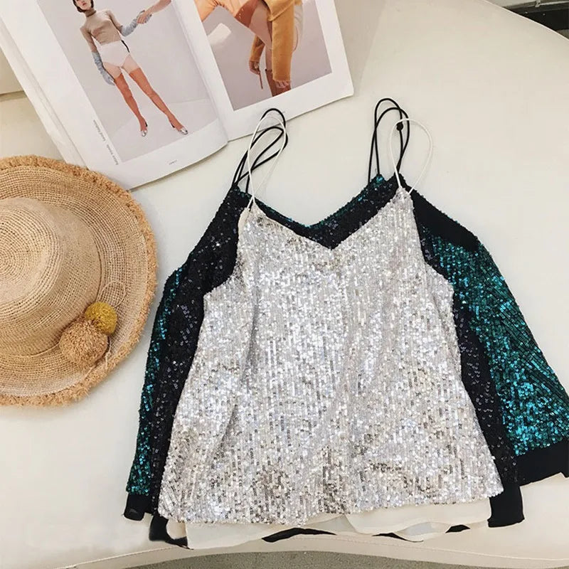 Women's Loose Casual Sequined Camisole Vest V Neck Shiny Sexy Sparkling Basic Top Fashionable Versatile Summer Top