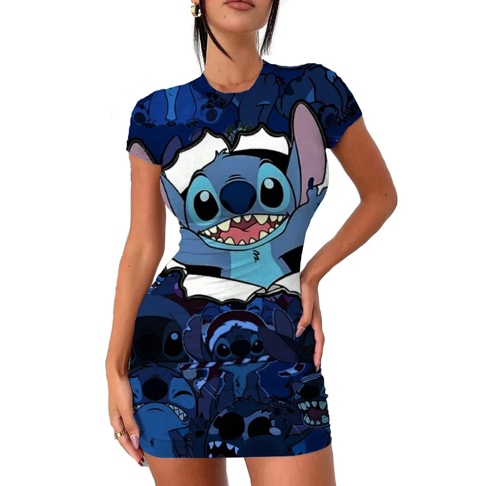 2022 Disney Stitch 3D Cartoon Print Tight Dress Short Sleeve Women's Tight Mini Dress Hip Print Kawaii beach party Women's Dress