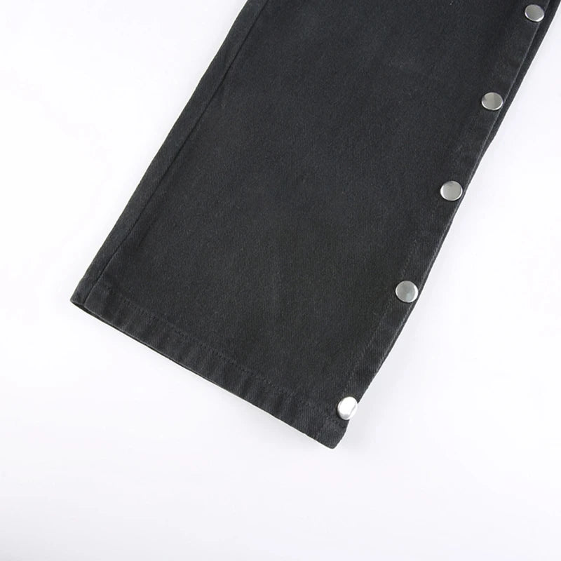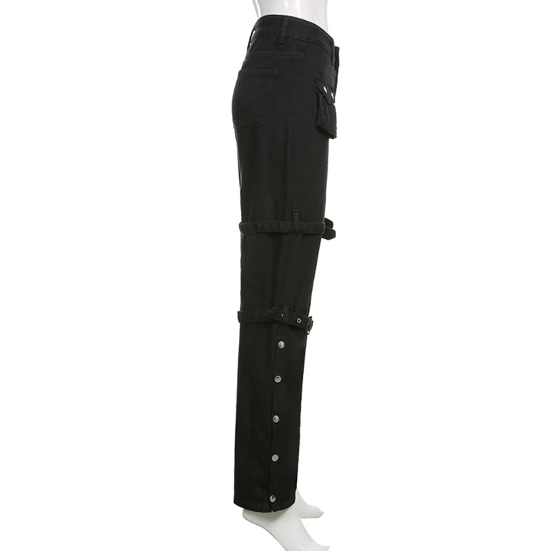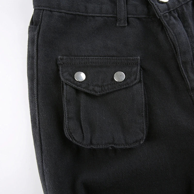 2022 trend Women Black Cargo Jeans with Multi Pockets Metal Buckle Belt Straight Trousers