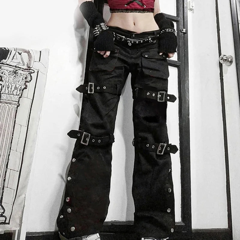 Gothic punk black color, two front flap pockets and 2 back pockets, metal buckle belt decoration.
