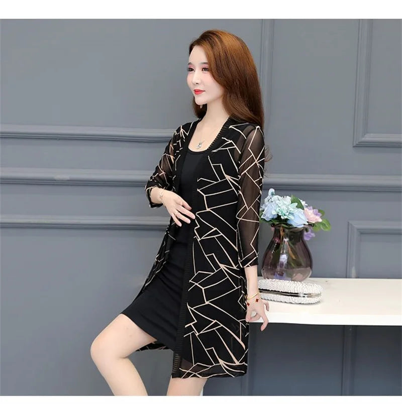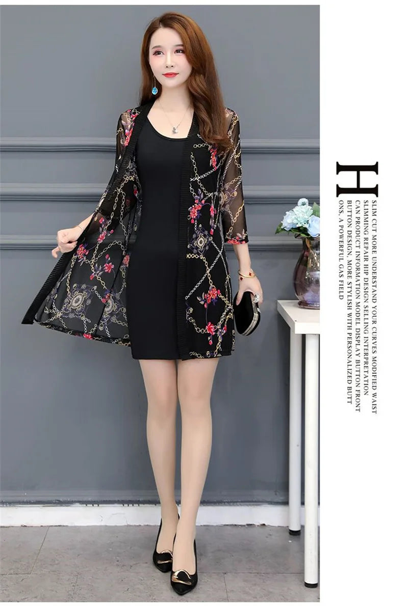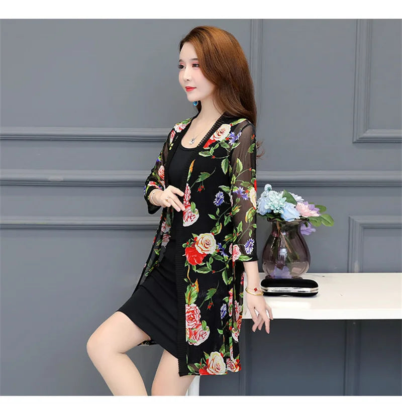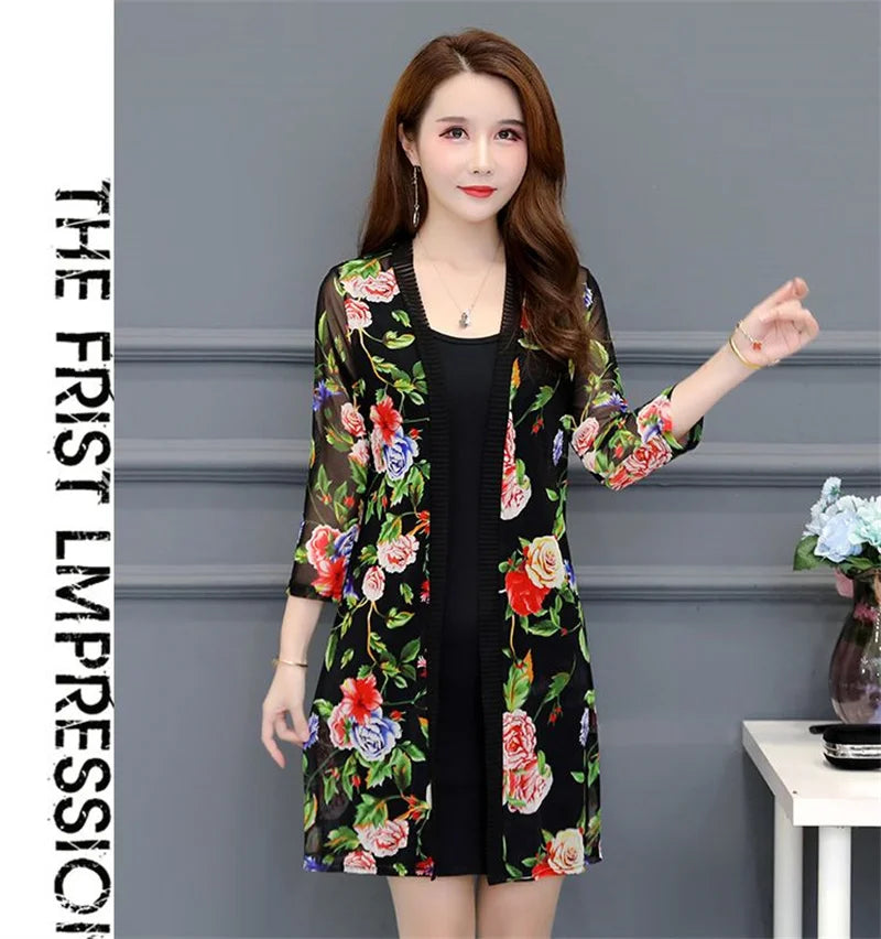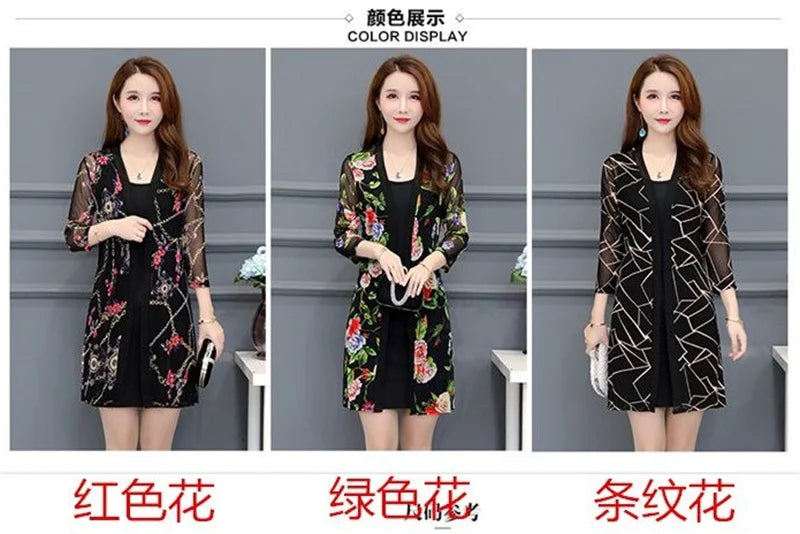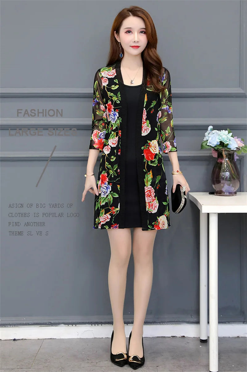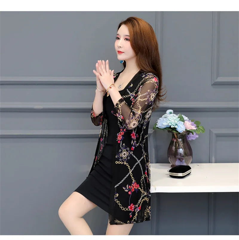 2024 Female Mid Length Large Size Sun Protection Cardigan Tops Coat Women Summer Gauze Lace Print Thin Sun Sunscreen Jacket 5XL