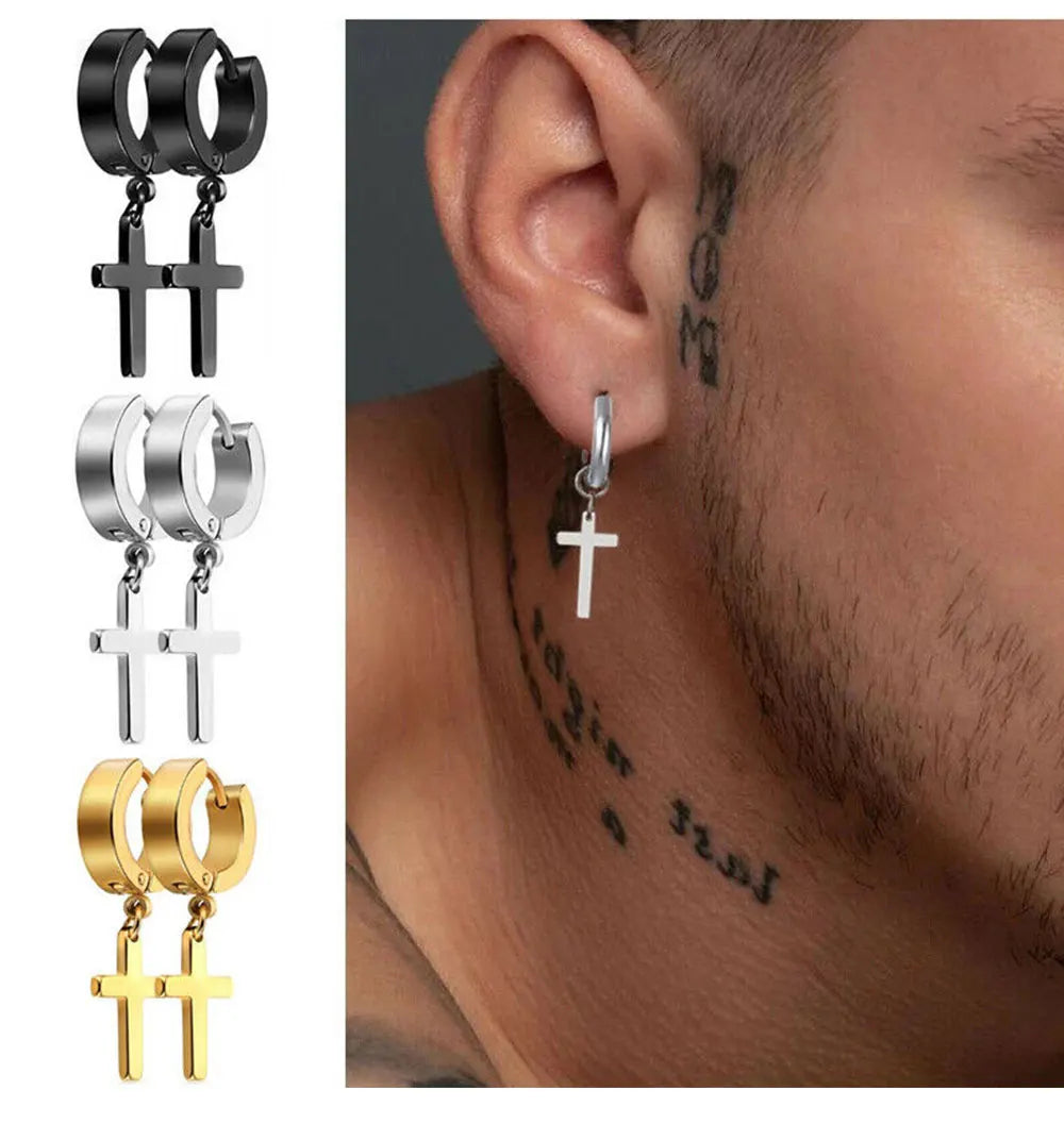 2pc Stainless Steel Men Cross Stars Punk Dangle Earrings Gothic Woman Cross Ear Hoop Earrings Huggies Pendant Piercing Jewelry
