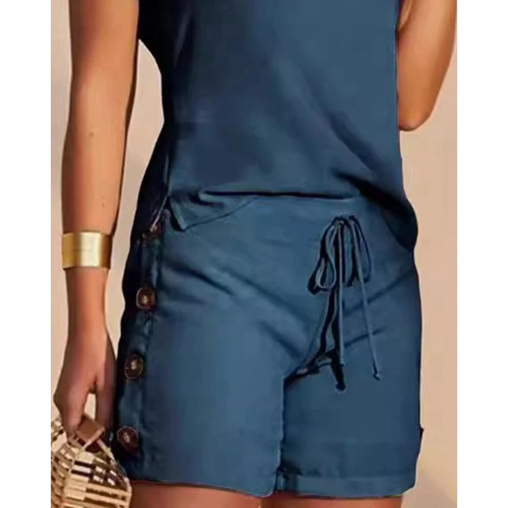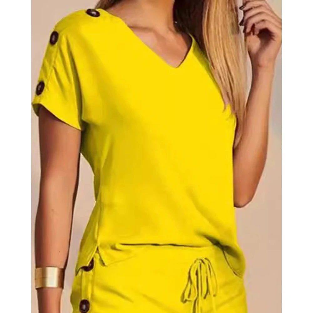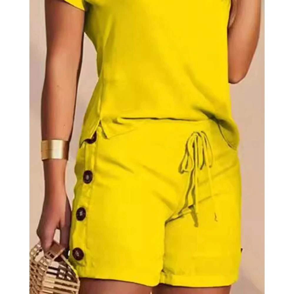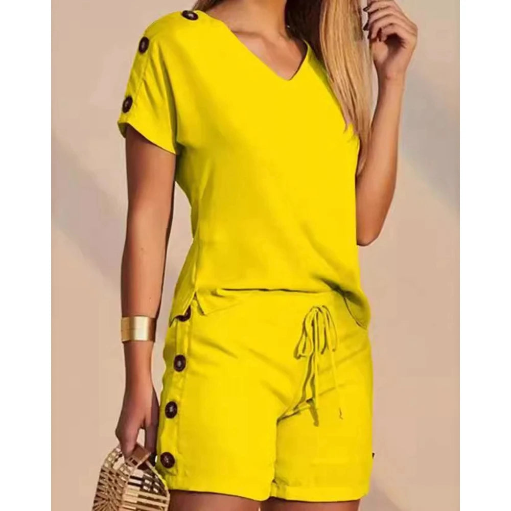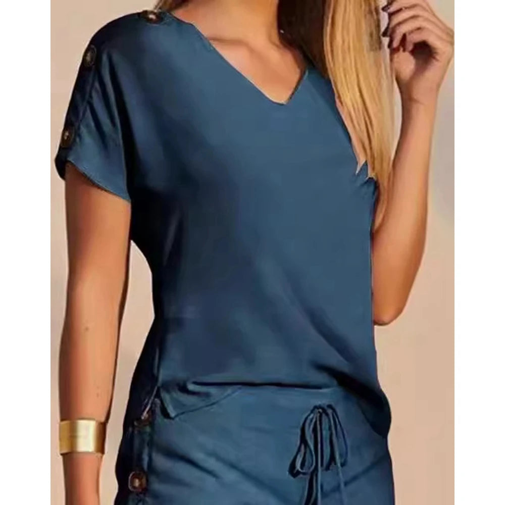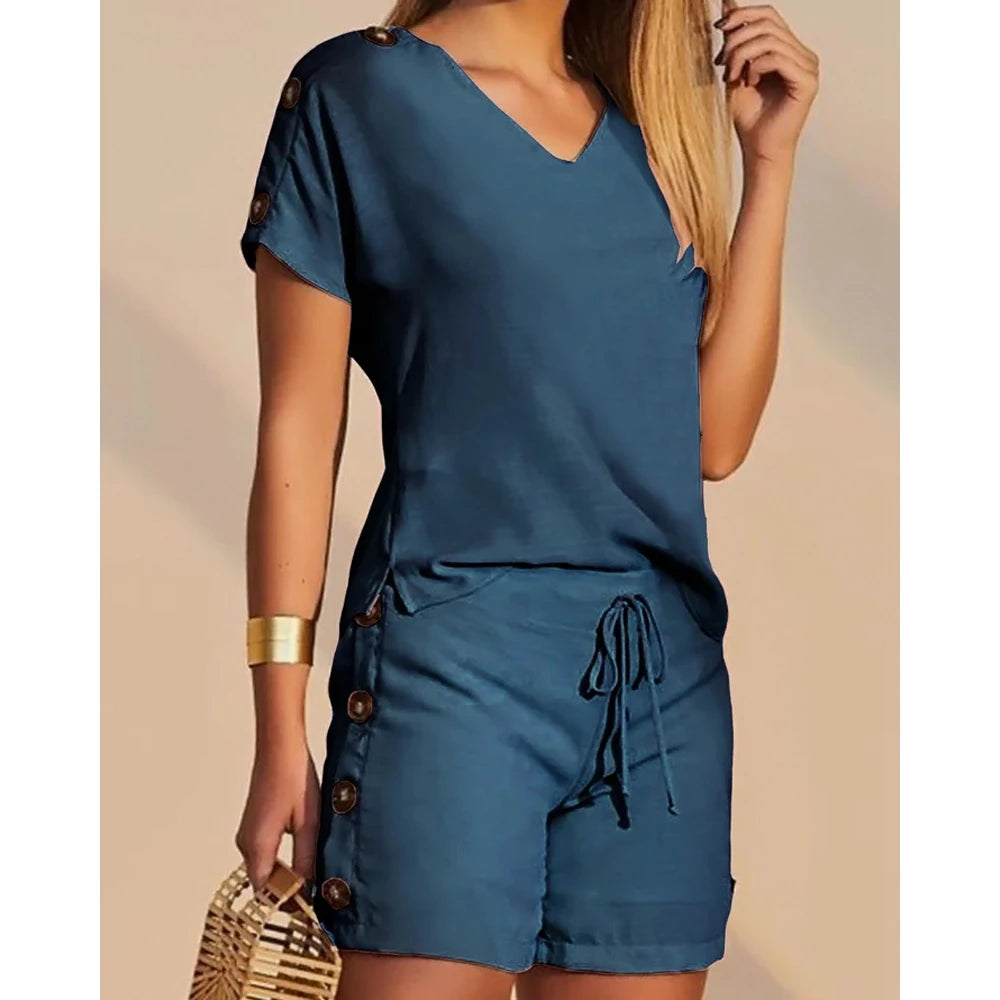 Women Buttoned Short Sleeve V-Neck Top & Drawstring Shorts Sets Women 2 Pieces Casual Two Pieces Set Summer Outfits Clothing