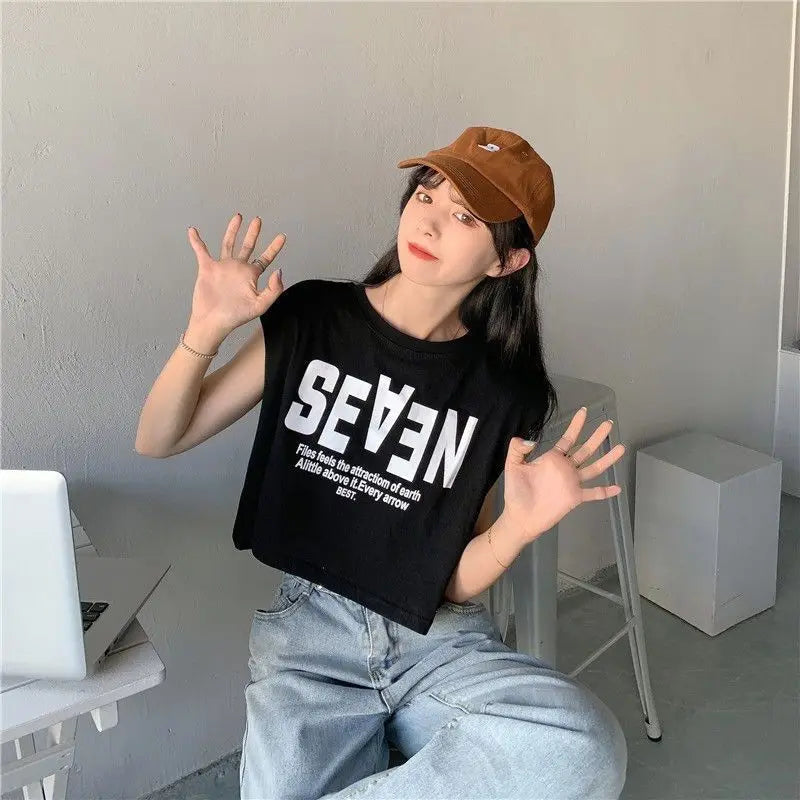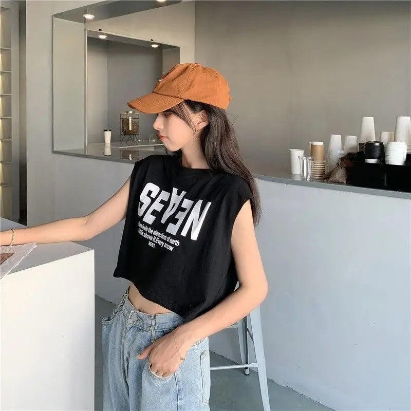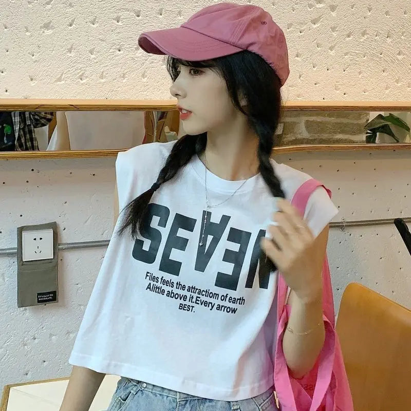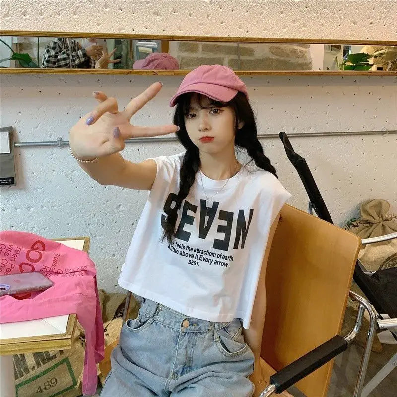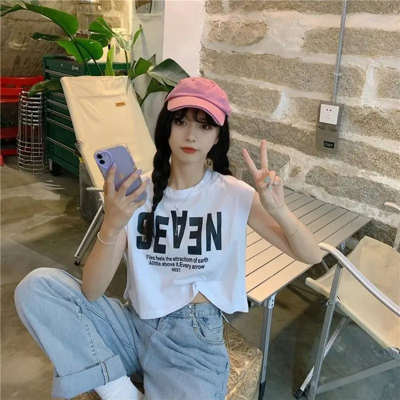 Women Clothing Summer Fashion Casual Letter Solid Color O-neck Female Simplicity Trend Appear Thin Sleeveless Tank Top Cardigan