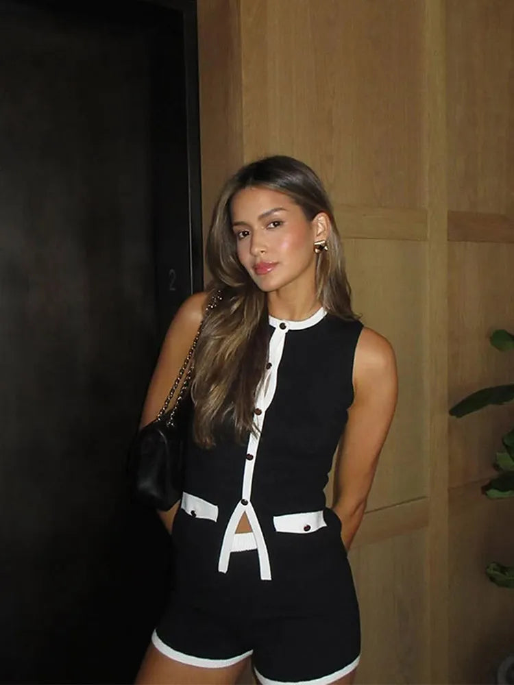 Women Contrast Knitted Shorts Set Elegant Round Neck Sleeveless Pockets Slim Fit Tops Suits 2025 Lady Party Vacation Streetwear