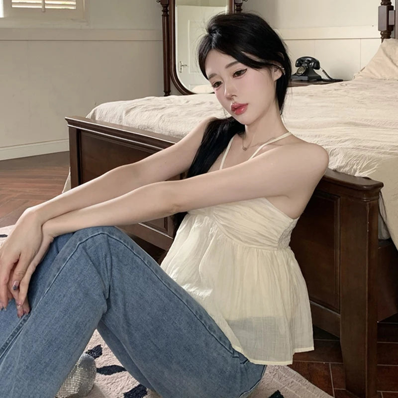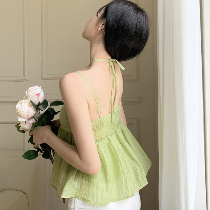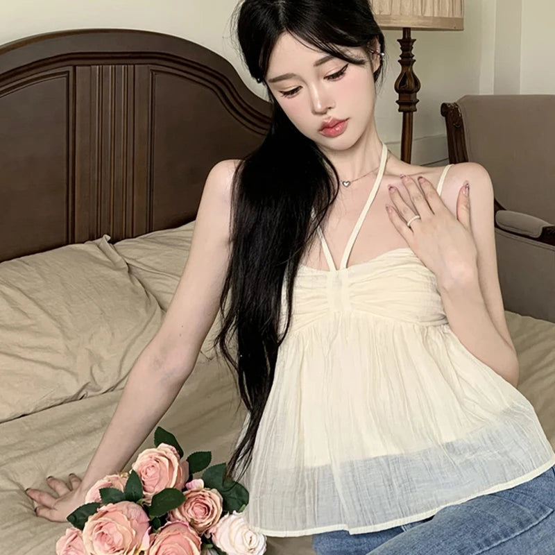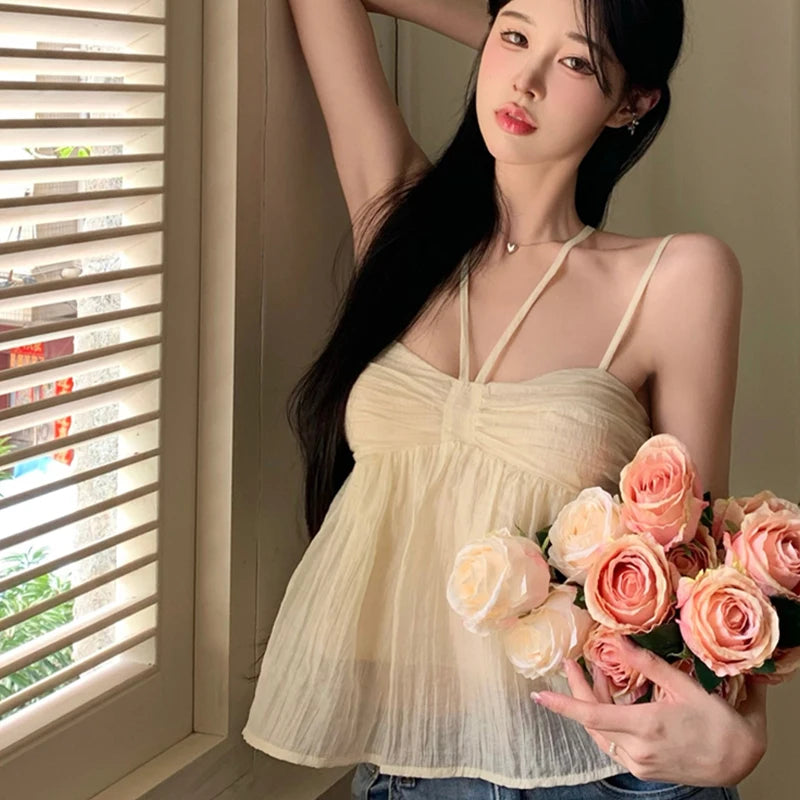 Women Crop Halter Camisole Solid Color Summer Spaghetti Strap Tank Tops Sleeveless T-Shirt for Streetwear Clubwear